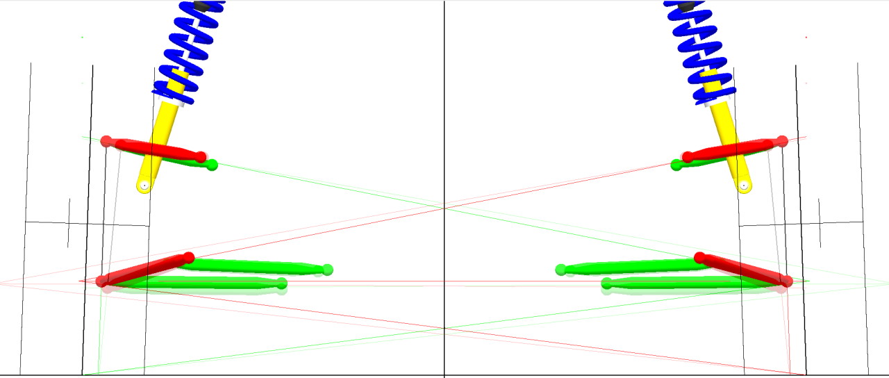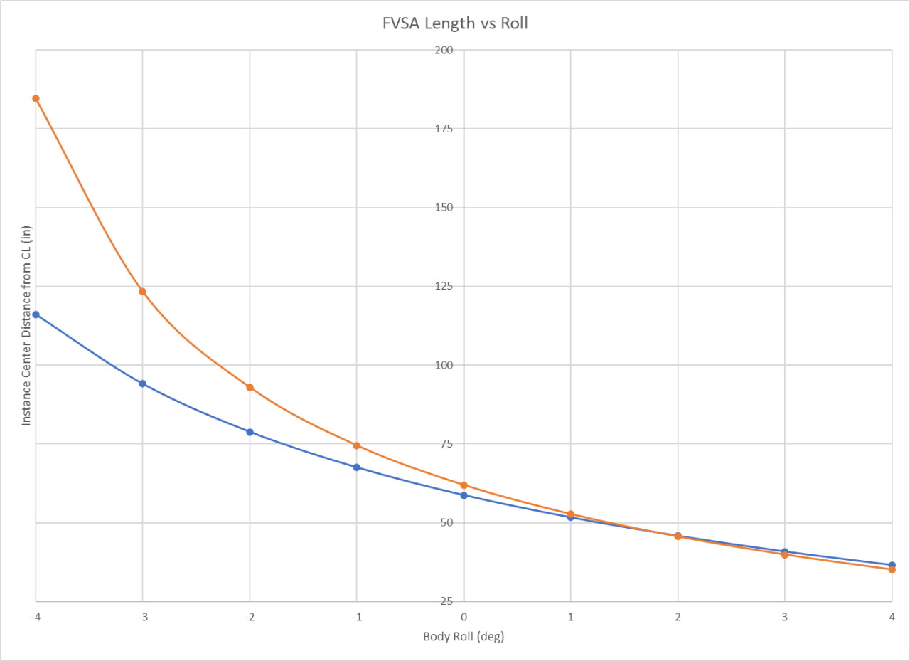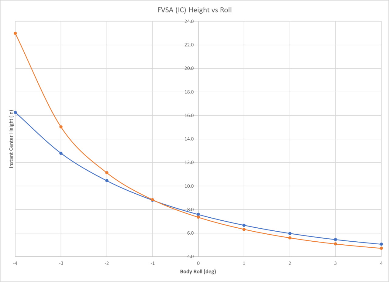 The main thing I didn't like about the original design was the length of the upper arms. They were just a little on the short side. And while the camber curve and toe curve was both good, some of the "secondary" parameters didn't look a nice. Mostly I'm talking about the movement of the instant centers, which where moving quite a lot as the suspension moved. Some people will say that the movement of roll centers (and instant centers) doesn't really matter much, but I have always felt that when any of these sort of parameters changes rapidly it's not a good thing. It certainly seemed to me that reducing roll center movement on the strut suspension improved the overall "feel" of the suspension. Here's the before (orange) and after (blue) graphs of the instance center positions vs body roll. Note that this only shows the left side of the car, and positive body roll is a turn to right while negative body roll is a turn to the left. Ultimately this means that I have mostly improved the unimportant side (outside / unloaded side) of the suspension, but hey, every little bit helps (I hope!).