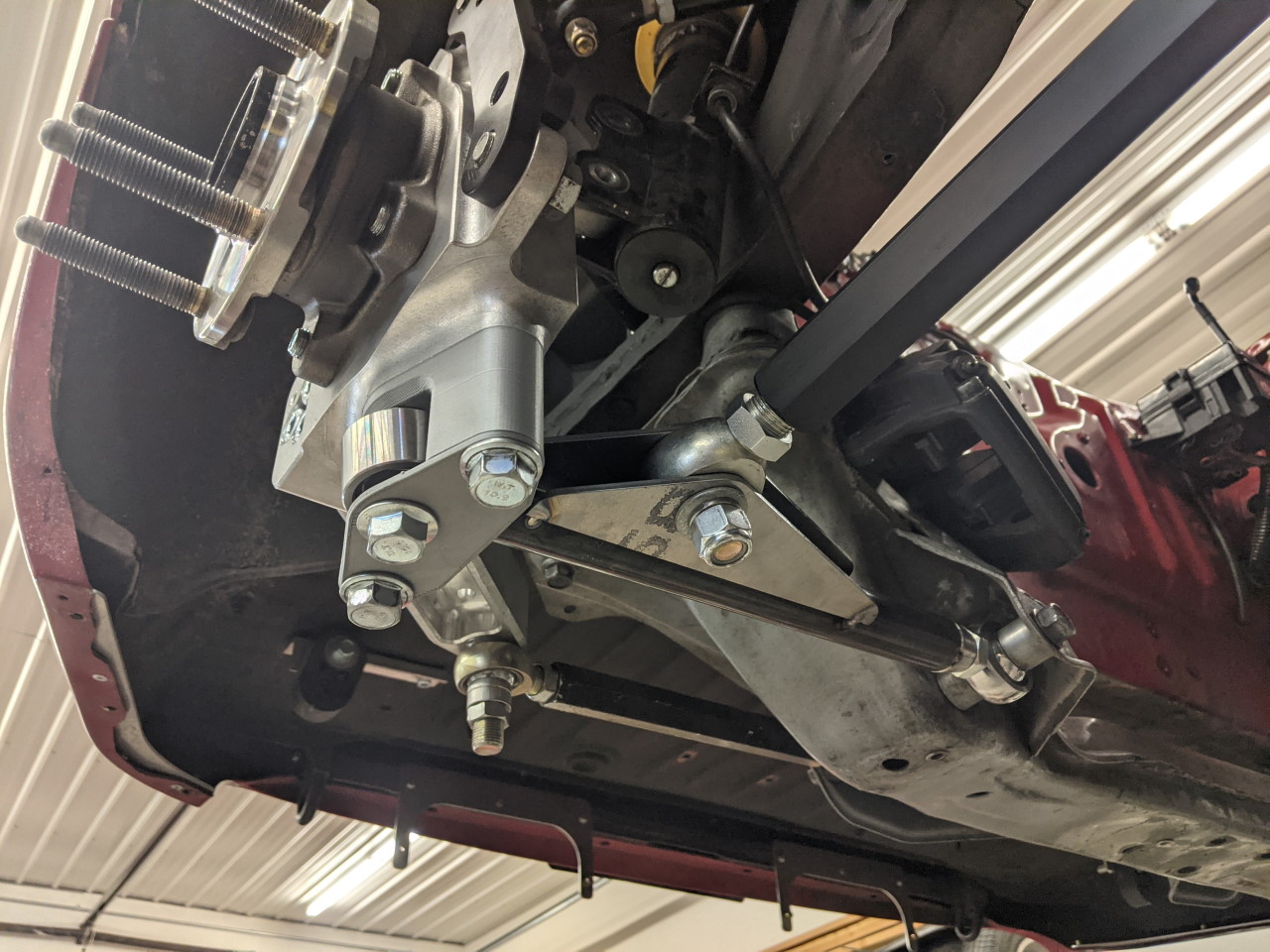 One side effect of the revised ball joint (and elimination of the cross member spacers) was that the optimal position of the rear tie rod at the knuckle was going to be inside the end of the toe arm. I had expected this, based on the suspension model, and when I checked bump steer after the initial install of the new parts, it was exactly as I expected. About .1" of toe change per inch of travel. There were two ways I could fix this. One would be to tilt the entire knuckle forward (essentially adding negative caster, although for a non-steered wheel it doesn't function as caster). This would cause the toe arm to angle up, raising the tie rod pivot. But this also complicated the geometry in other ways, and just didn't seem like the ideal solution. But I had already added a new tie rod point in the cross member, and it is relatively easy to add another. With the longer upper and lower arms a longer tie rod is also appropriate, so I moved the tie rod point again, this time down and slightly inboard from the v1 position (if the outer end of the tie rod needs to go up, you can accomplish the same geometry change by moving the inner end down).