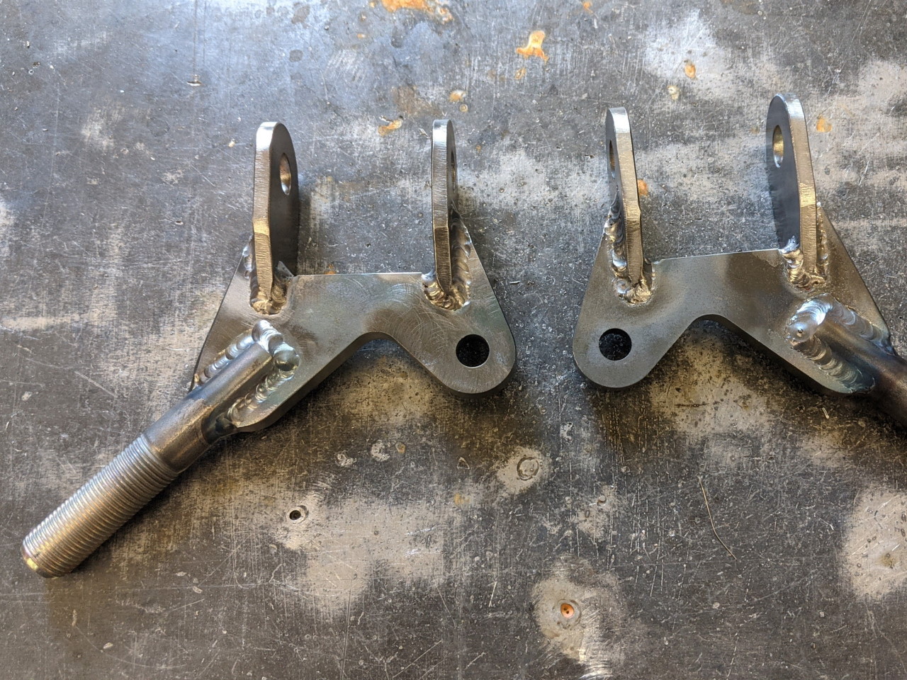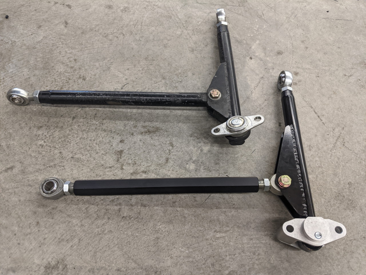 The new upper control arm consists of a welded assembly similar to the old one, but with a double shear clevis instead of the old versions spherical bearing. If you remember v1 had a pair of clevis fittings that attached to the bearing plate, one of which was welded in place to prevent rotation. I was never 100% happy with that design, even though the analysis said it should be totally fine. This with the more solidly welded threaded stud should be stronger AND is more professional looking (in my opinion). The second clevis fitting is still necessary to allow the angle of the arm to adjust slightly when setting camber, as well as to allow the upper arm to be installed as it won't go in in one piece due to the angles of the boxes in the frame. Weight wise, the upper arm basically broke even. Some pieces are a little heavier, some a little lighter, it ended up virtually identical in weight to the old version.