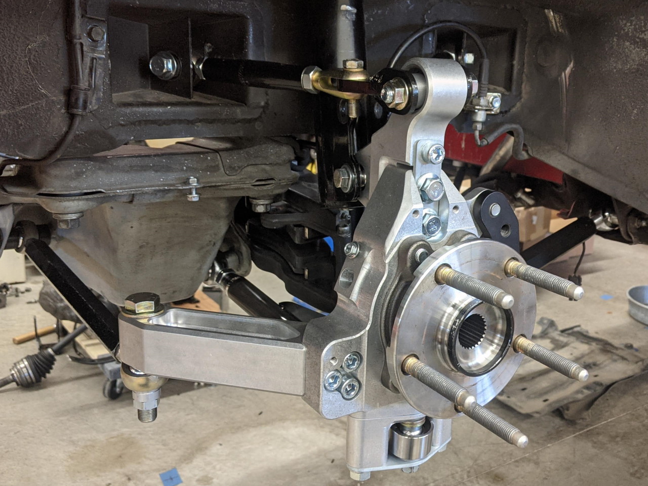 I seriously considered doing something custom with the brakes at this point (thinner hat, modified bracket, etc) to push the brake rotor out and make room to lengthen both upper and lower arms by another 1/2" or so. This would have had the additional effect of further decreasing the scrub radius, but it would have required either modification of the caliper as well (or switching to a different caliper), and I just decided that it wasn't worth taking it to quite that level. Another option I considered was purchasing new higher offset wheels and lengthening the arms that way (pushing the entire hub and knuckle further into the wheels). But again, further than I wanted to go. I have multiple sets of wheels already, and high offset wide wheels are hard to find (they probably would have to be custom in fact). This was the best middle ground compromise.