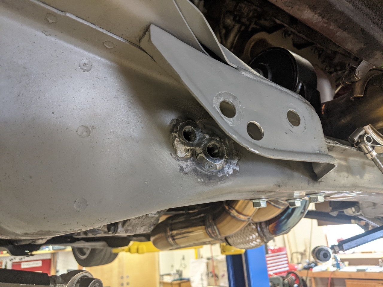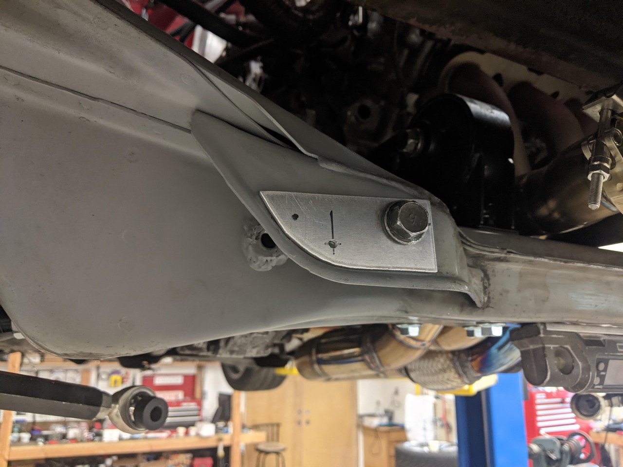 It turned out, when Apex Attack put this to the test on the track, that this modification to the toe curve had resulted in too little toe in, resulting in some instability especially under braking. The solution instead was to go back to the stock toe arm position on the cross member and modify the toe arm on the knuckle to raise the pivot point to match, as shown below.