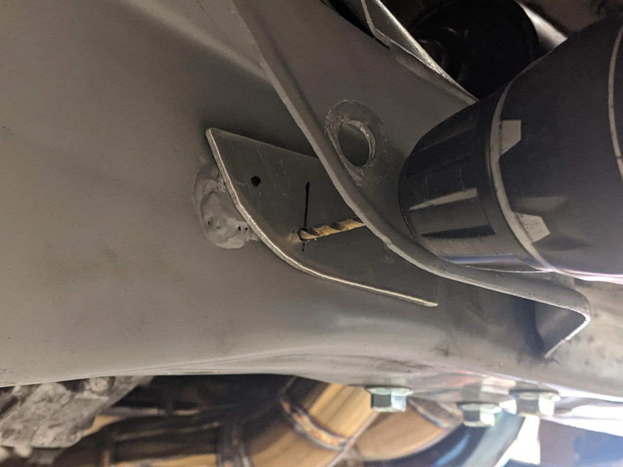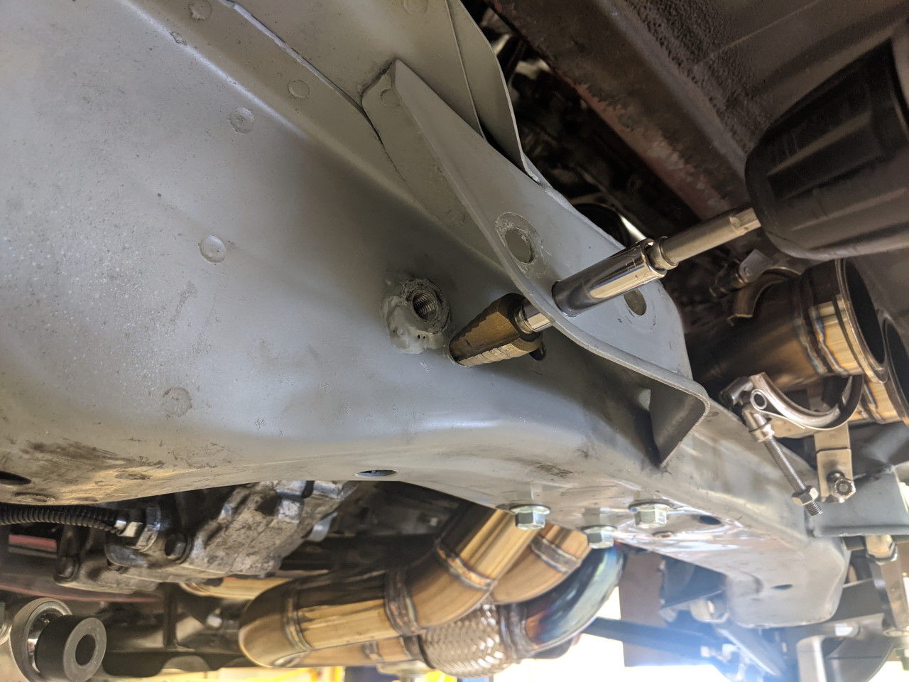 The holes are then both drilled out to 1/2", and that's when things get tricky... In order to insert the weld in nut (modified M12 flange nut), I need to enlarge the inner hole to 5/8", without changing the outer hole... A step drill driven with a socket does the trick. I had to slightly shorten the shank on the step drill to get it into place, but it was the easiest and most precise way to accomplish the goal. Weld in the new nut, and done. I may have an excessive number of tie rod attach points now!
