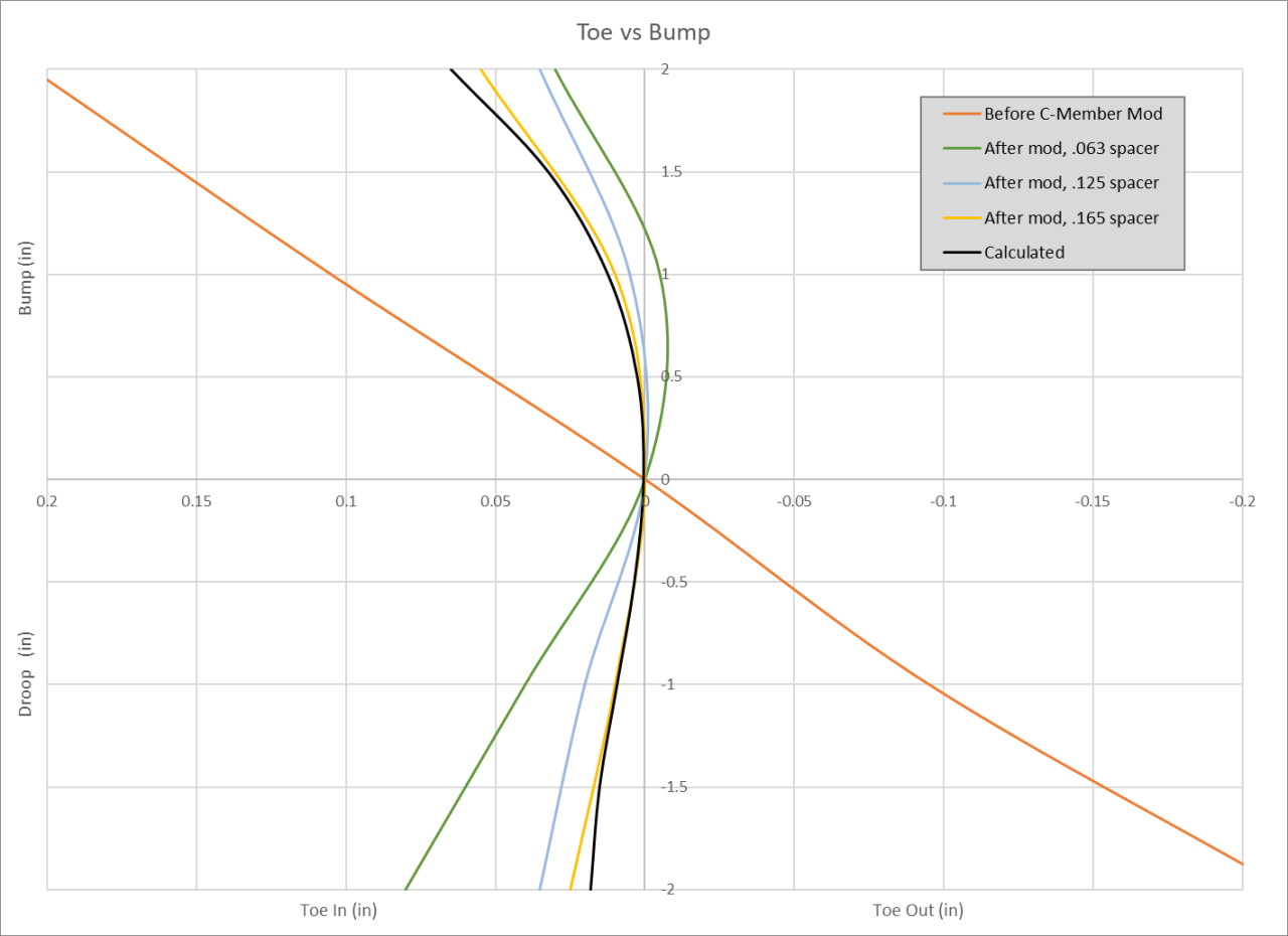With the revised cross member, I checked bump steer again. I ended up adding about .1" of spacer above the rod end at the knuckle, which gave me a measured toe curve nearly identical to what my model had predicted. It only took about .05" more spacer than the model had predicted, which is a very nice validation of the accuracy of both the model, and the location of all of the new pivot points. Here's a graph of the toe curve before the latest crossmember mod, plus after bump steer adjustment.