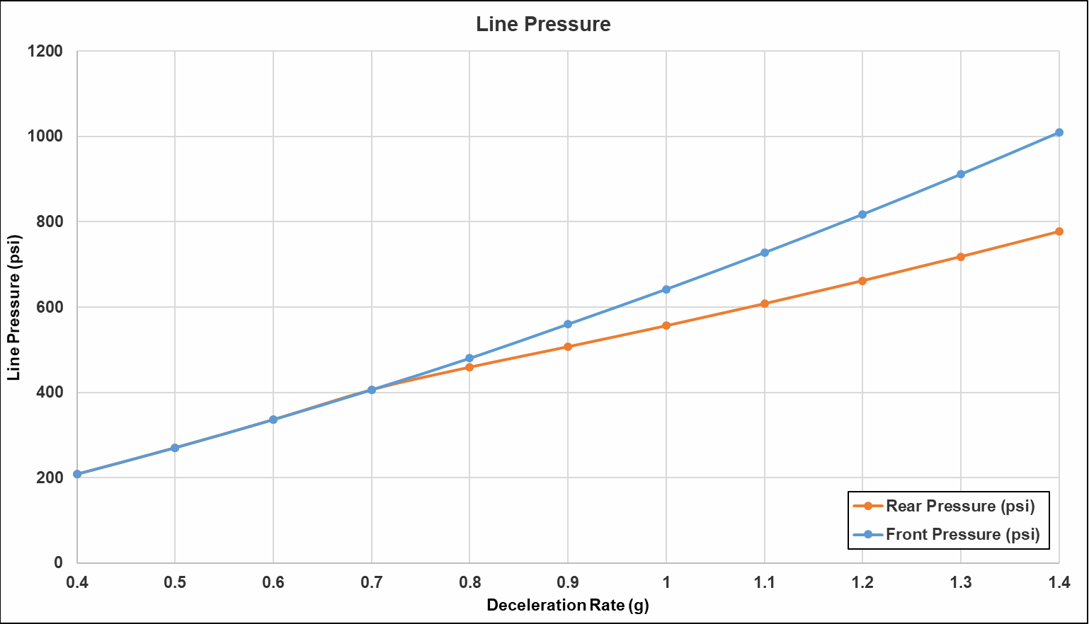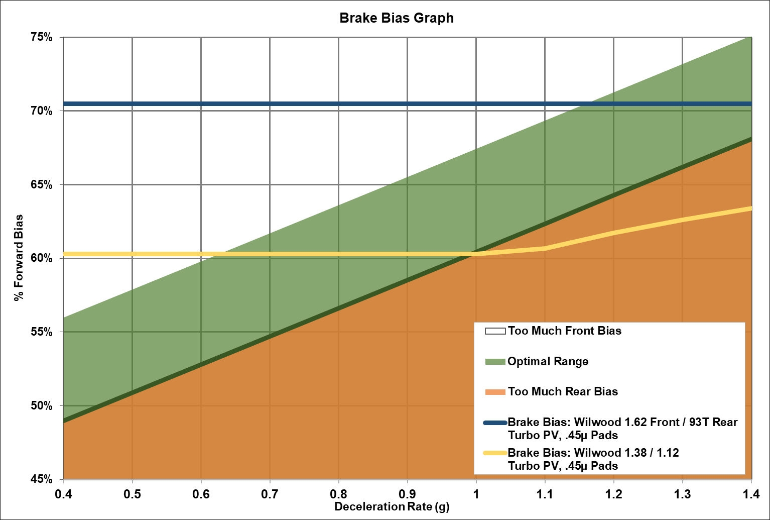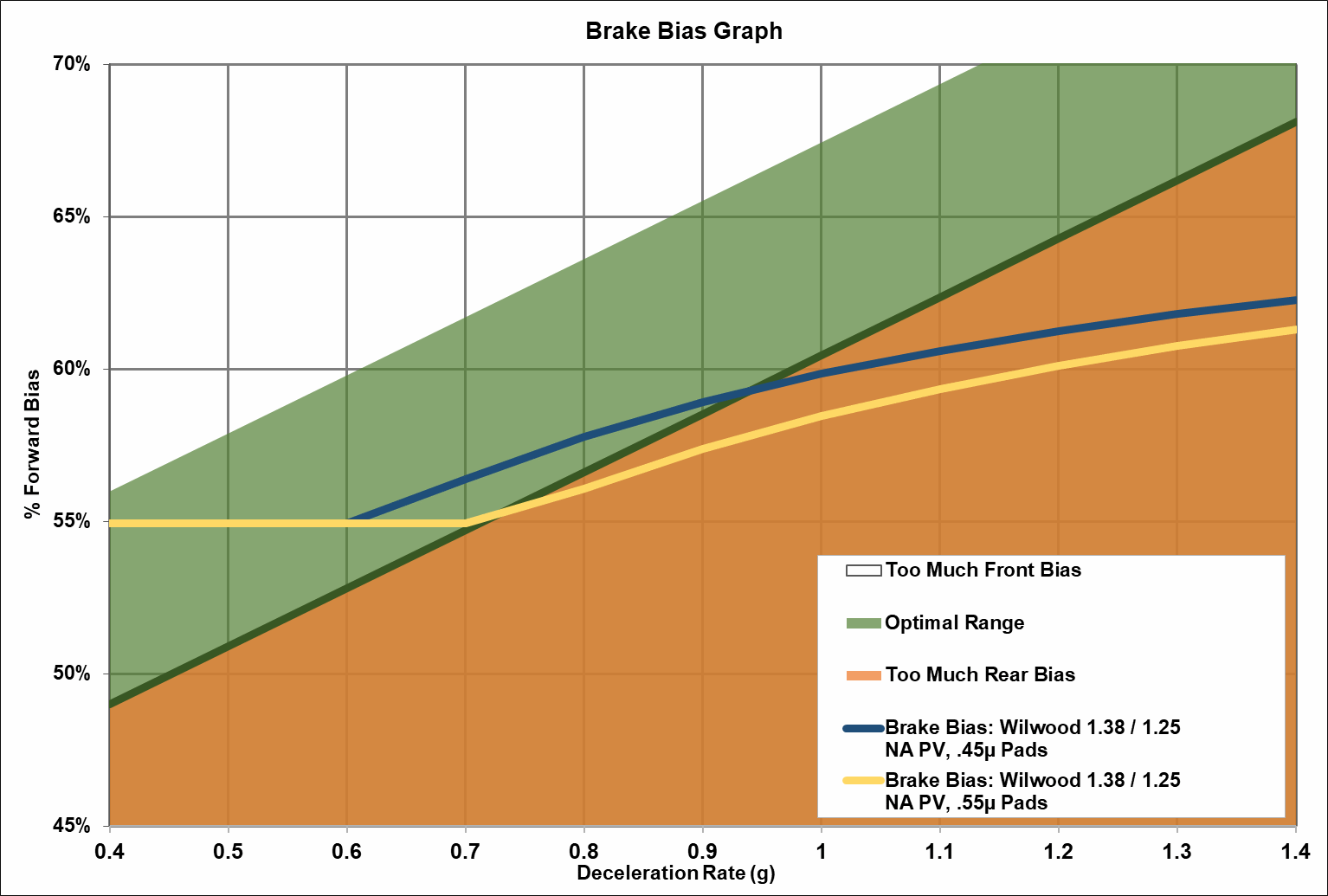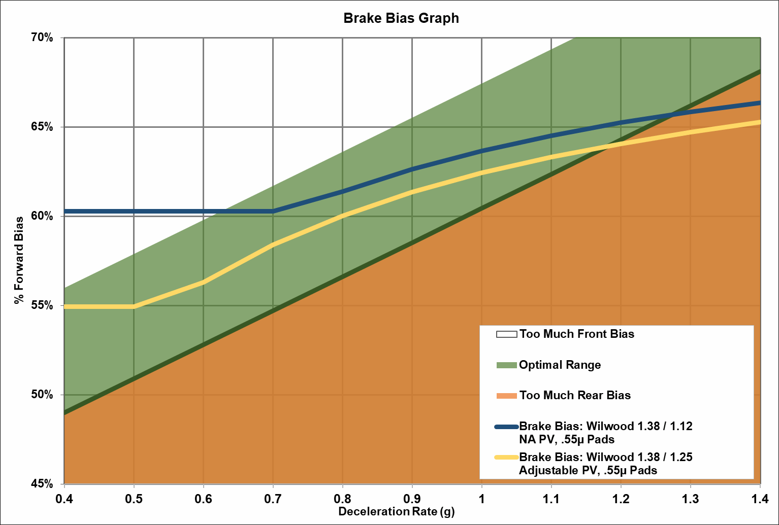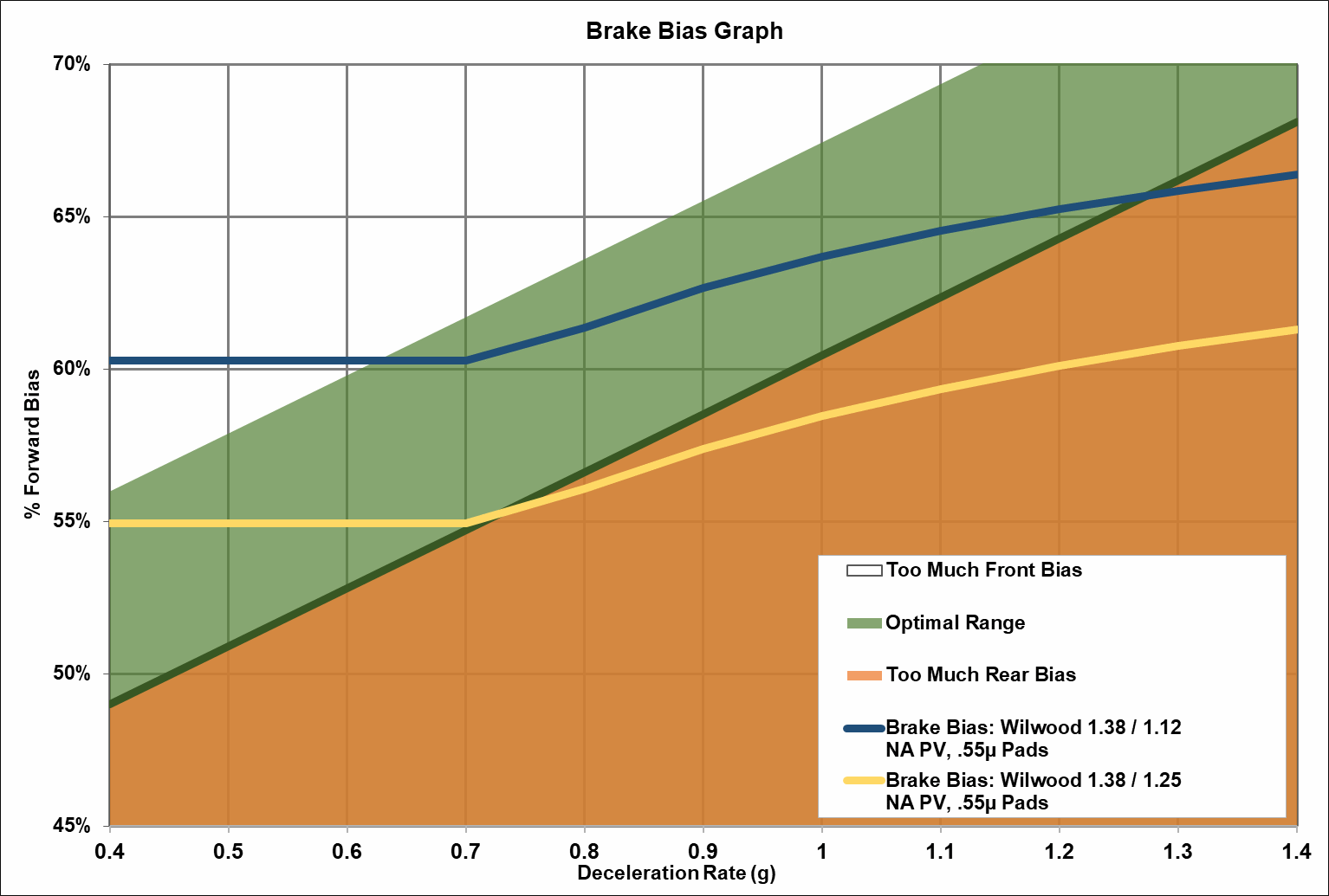 For those looking for a truly ideal solution, an adjustable proportioning valve can be tuned to provide optimal bias over a wider range of deceleration rates. The graph below shows the effect of switching the rear calipers back to the 1.25" pistons and replacing the NA valve with a Wilwood adjustable valve with a slope of .50 and the knee point set to 300psi (approximately 1.5 turns in). This produces a brake bias that is nearly optimal from .5g to 1.2g.