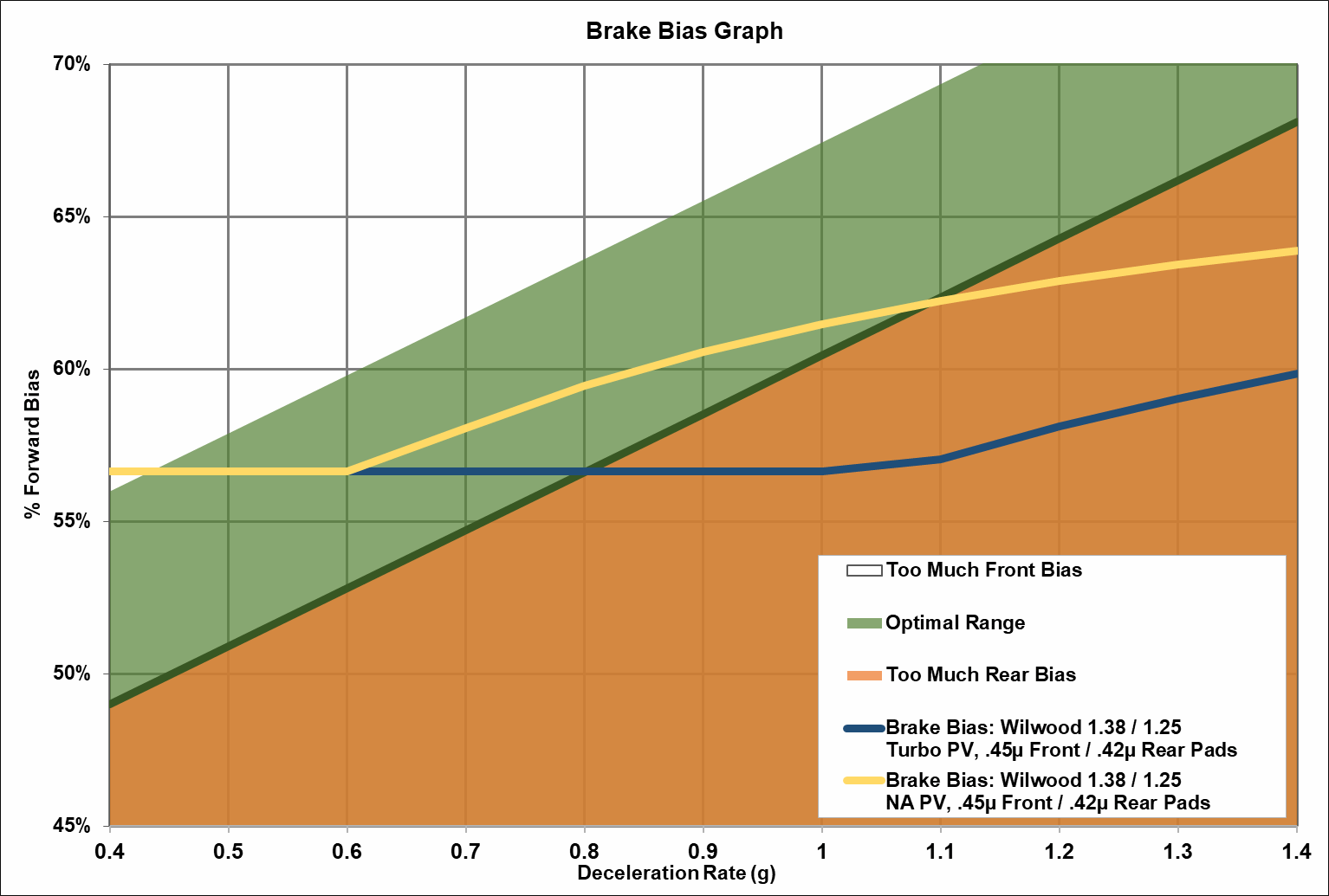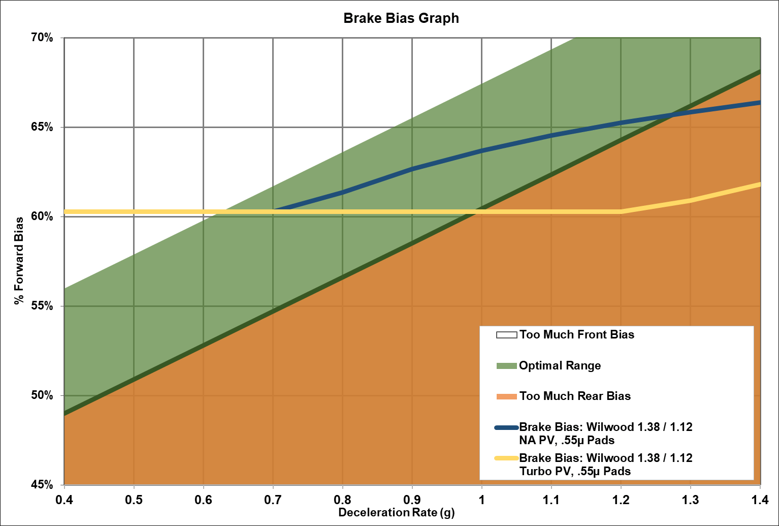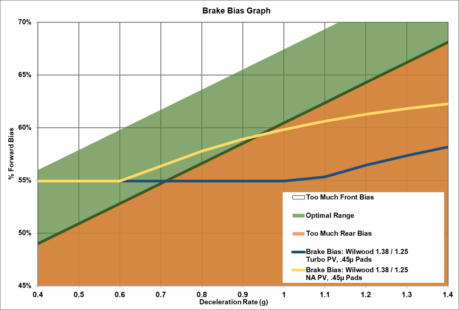 This graph shows the bias curve for my kit using the Wilwood FSL calipers with 1.38" front and 1.25" rear piston sizes and .45µ pads and 12.19" rotors. Note that with the NA proportioning valve the bias is reasonably good, although it crosses into the potential rear lockup zone a little before 1g. However, the turbo proportioning valve with it's much higher knee point causes the bias to be much further rearward, about 6% too far rearward at 1g.