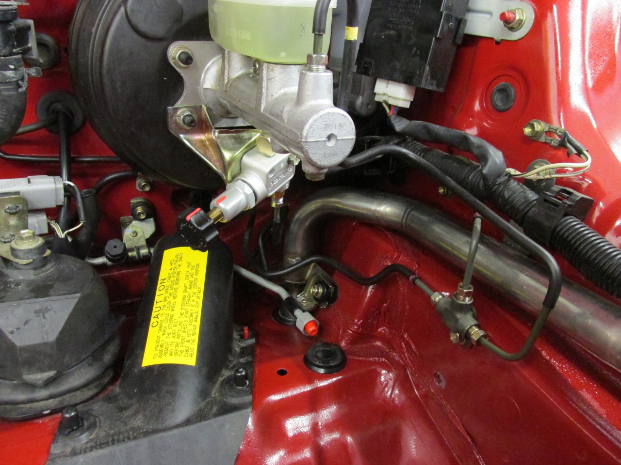 And here it is installed in the car, using the stock proportioning valve bracket from an ABS brake system, and a combination of ABS and non-ABS plumbing.  The valve I used is Wilwood part number 260-8419.  I used 1/8npt to M10 inverted flare adapters from Technafit, to adapt from the valve to the stock brake lines and a T fitting from an MR2 stock rear brake line.  One warning on plumbing these, most of the MR2 brake lines have extended unthreaded noses on the tube nuts and won't fit any commercially available adapters or T fittings.