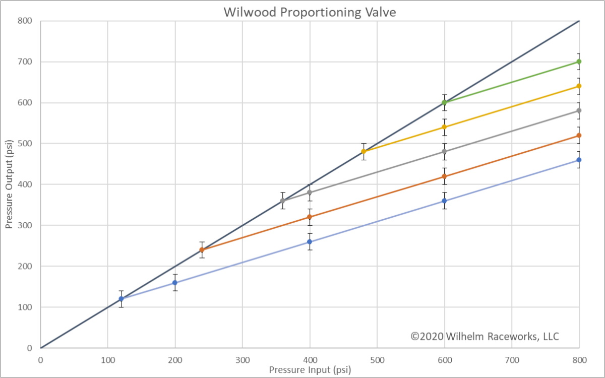 Two 1000psi pressure gauges, a few plumbing fittings, the proportioning valve to be tested, and an old master cylinder / brake pedal.  By applying pressure to the pedal with my knee and watching the gauges I can easily measure the effects of the proportioning valve at various settings.  In that way, I generated the data shown in the chart below: