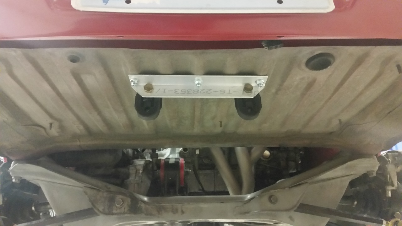 The project starts with a new mount, since of course the stock muffler mounts on either side of the trunk won't work very well for a center exit like I am planning to build. Also the mounts themselves are quite heavy. A piece of aluminum angle, bolted to the trunk floor in three places does the trick while also being very light weight. Bolted to it are two generic rubber exhaust hangers.