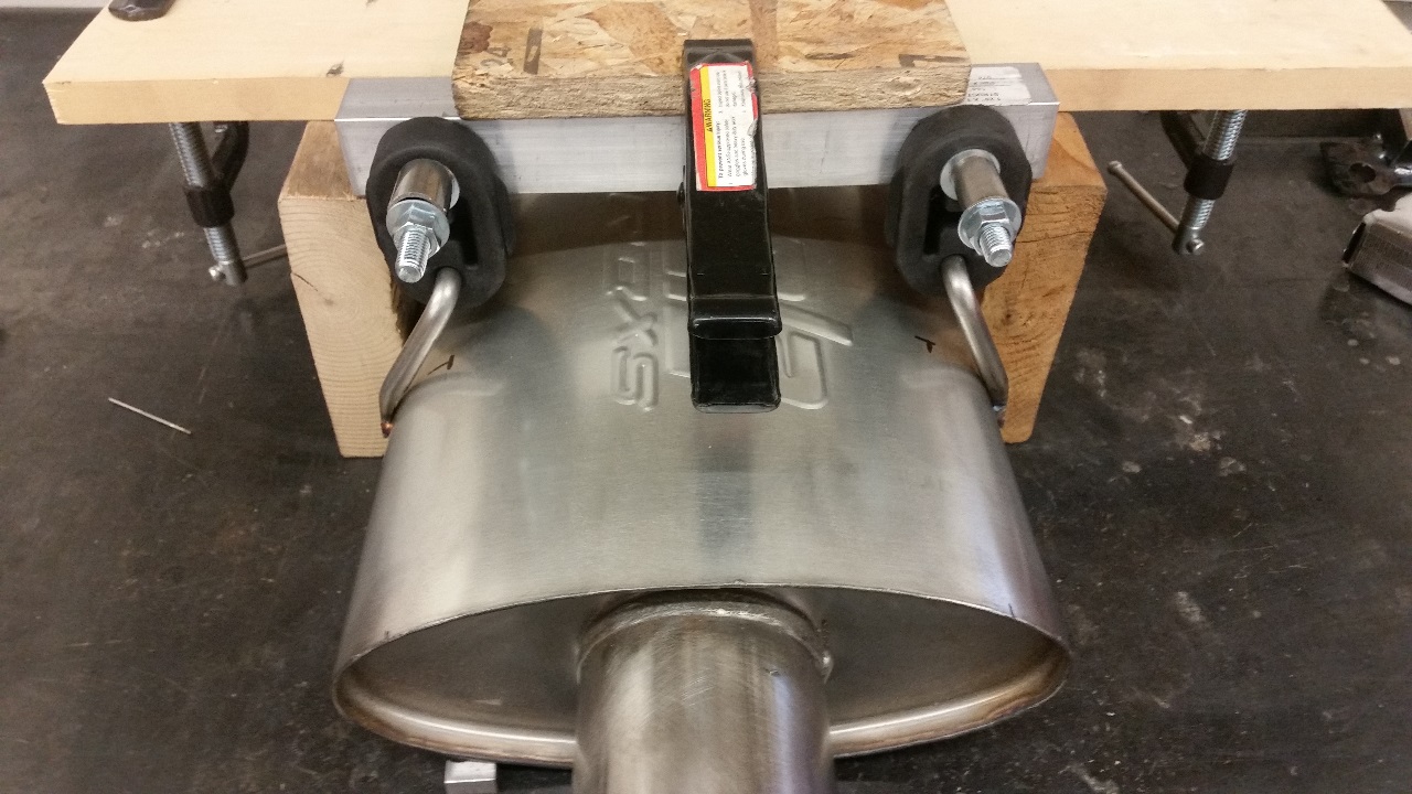 Next I figured out how close to the trunk floor I wanted the muffler to sit, and once that distance was determined I mocked it up with some scraps of wood, and tacked my muffler hanger rods to the muffler.