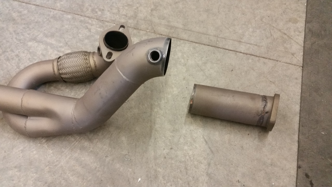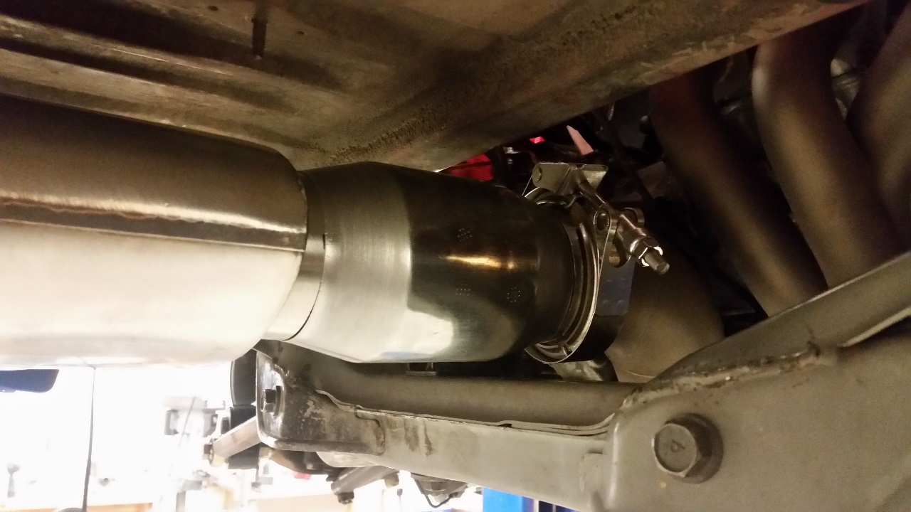 I tacked one half of the v-band flange to the y-pipe and then started cutting angles on both the Vibrant catalytic converter that I am adding and also on the inlet to the Borla Pro XS muffler until everything lined up just right. A lot of care was also taken during this process to make sure that the muffler outlet stayed centered.
