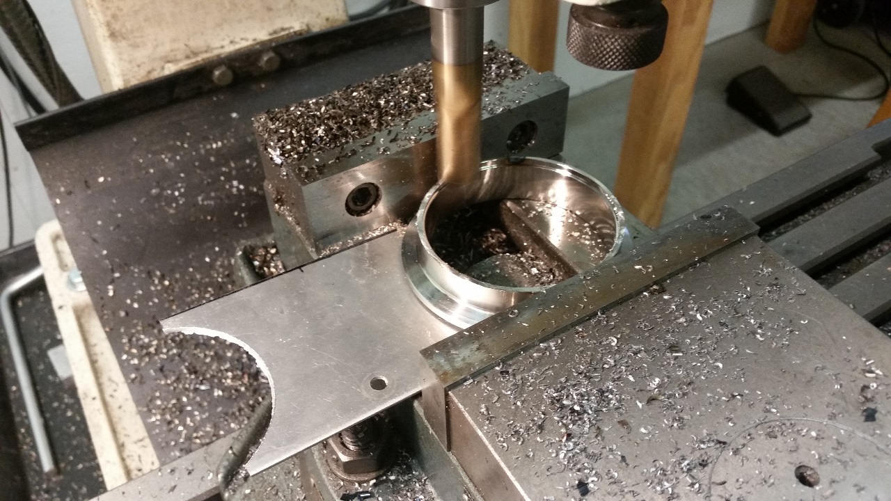 At one point in this process I found myself needing a little more angle on the cat inlet than I really wanted to cut, since the inlet was starting to get somewhat oval shaped. So I mounted the V-band in the mill with a shim under once side and machined a little material off of the edge, creating a tapered flange.