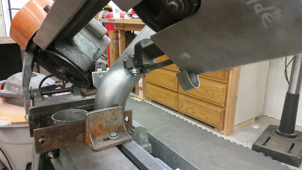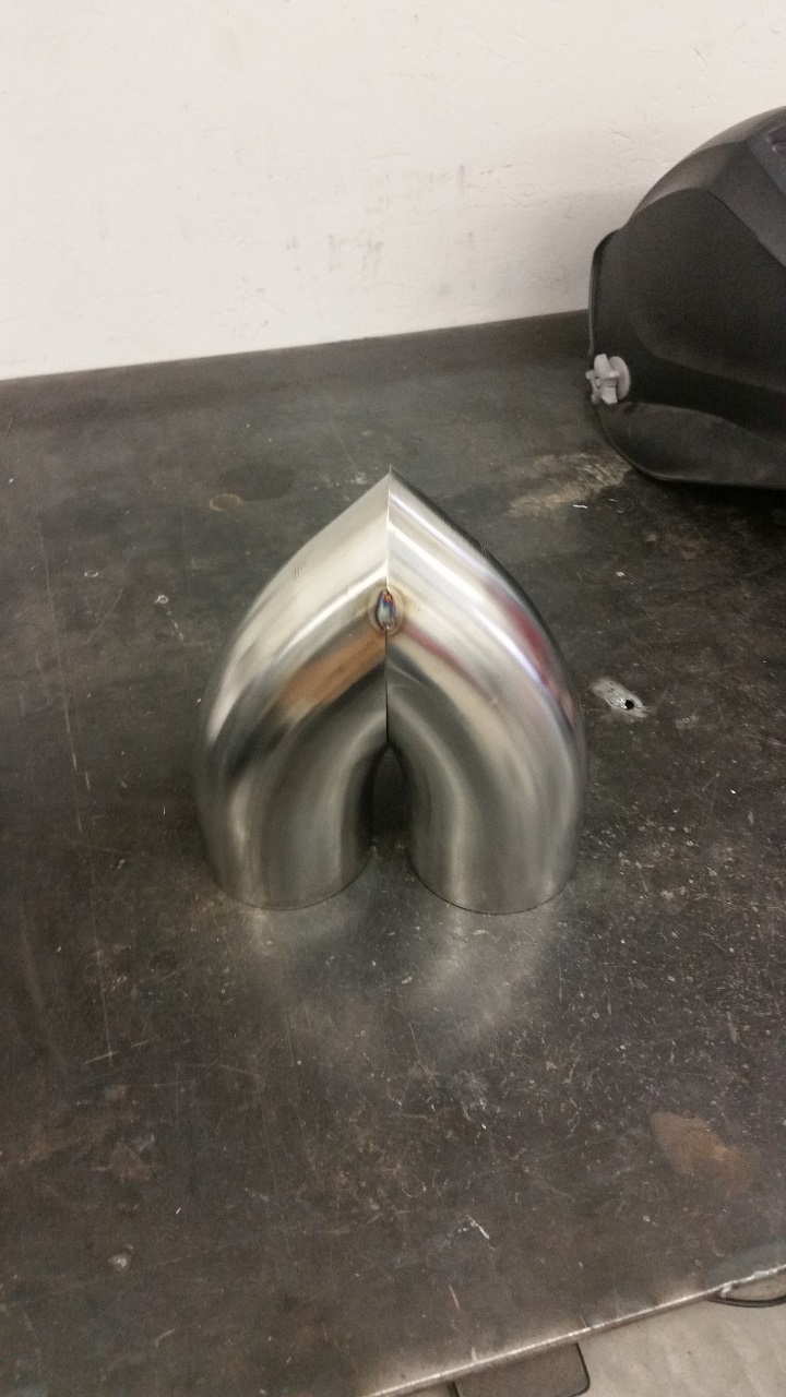 The tip started as two 3" diameter, 45° stainless bends. I wanted the tips ~1/2" apart, so first I cut both of them as shown below, with the cut 1/4" away from the edge of the pipe.