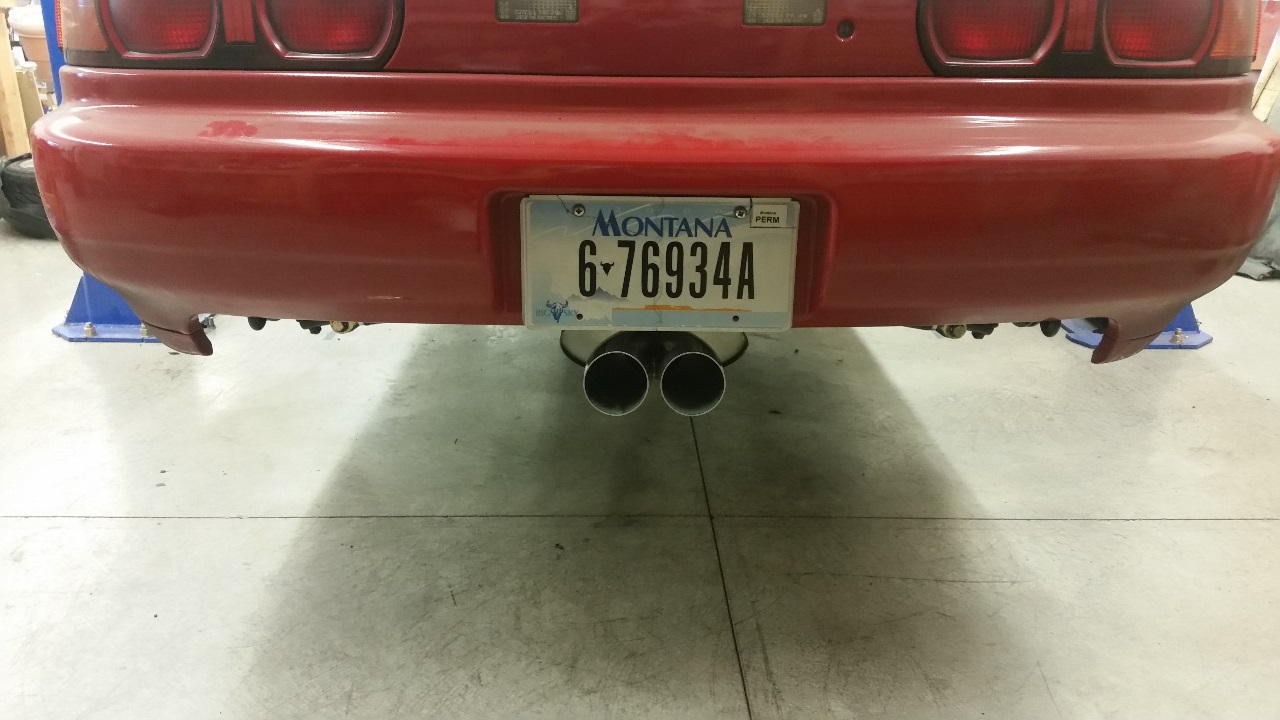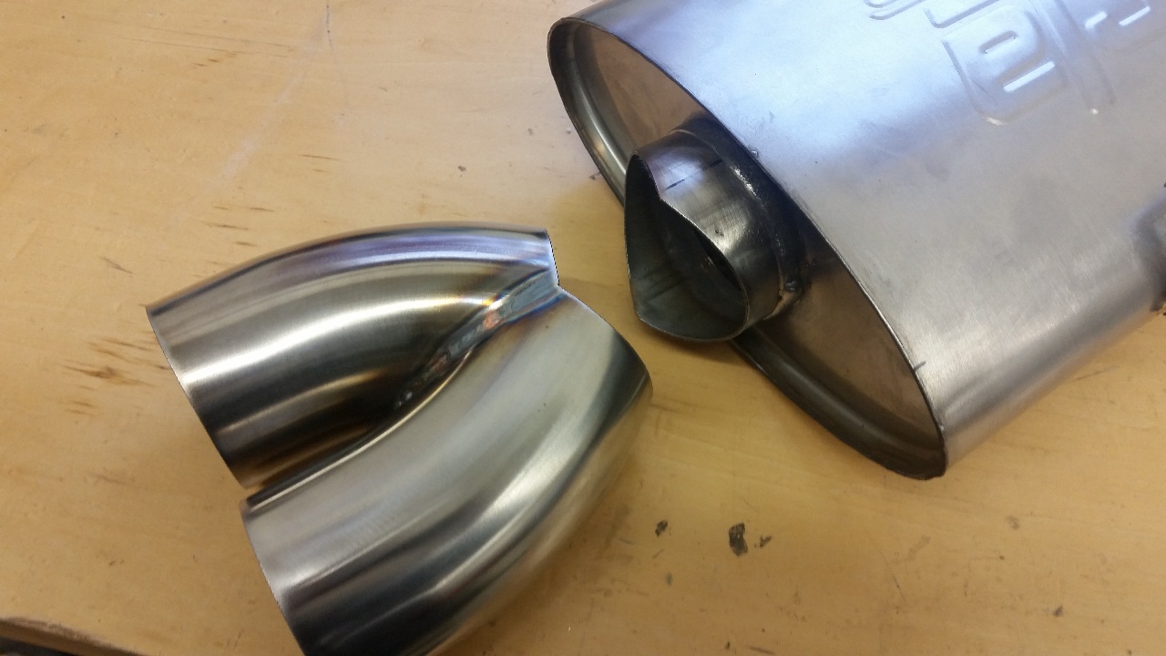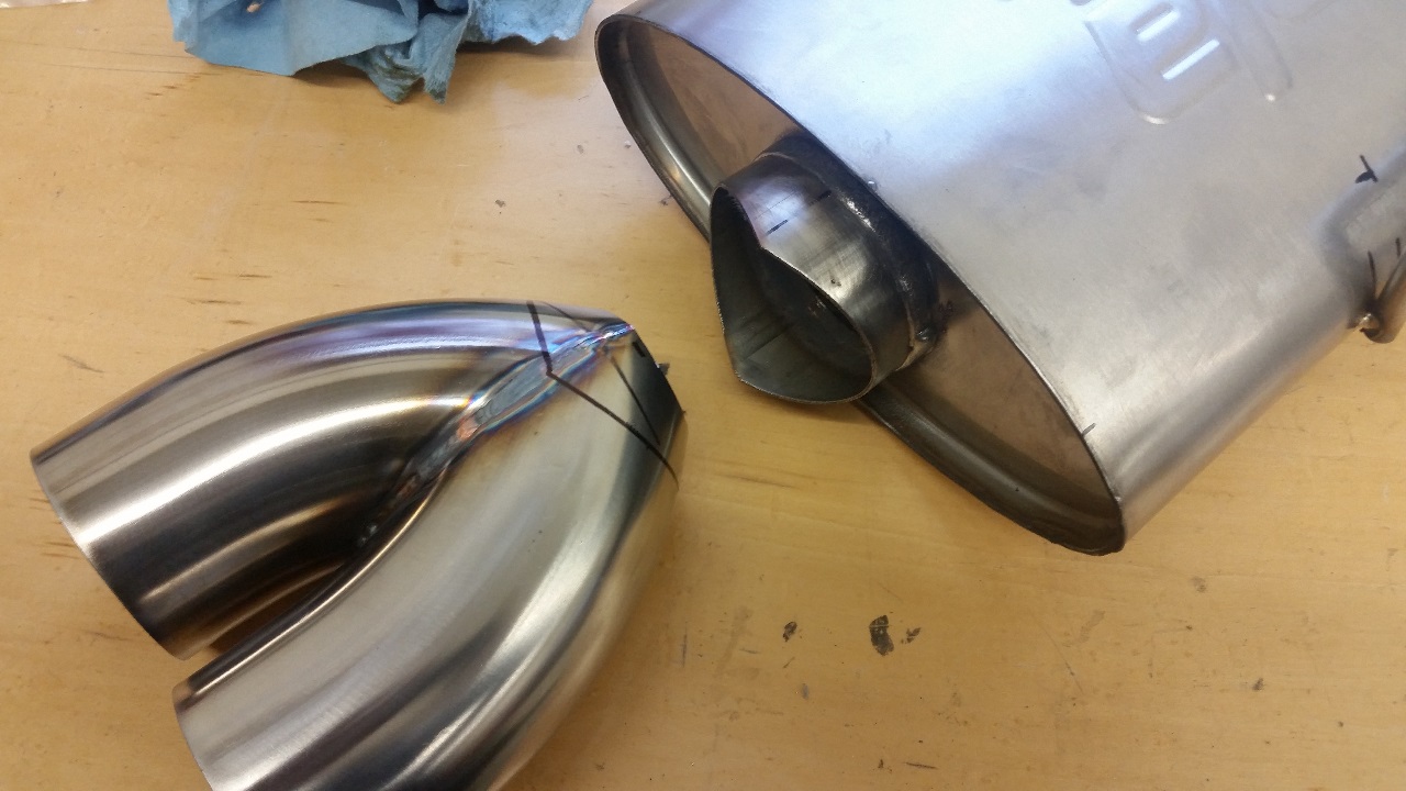 The plan in my head called for a dual tip under the license plate, but I couldn't find a ready made tip that I was happy with. They either all had smaller than 3" inlets, or were way too long, or way too expensive, or all of the above. So per standard procedure around here, I made my own.