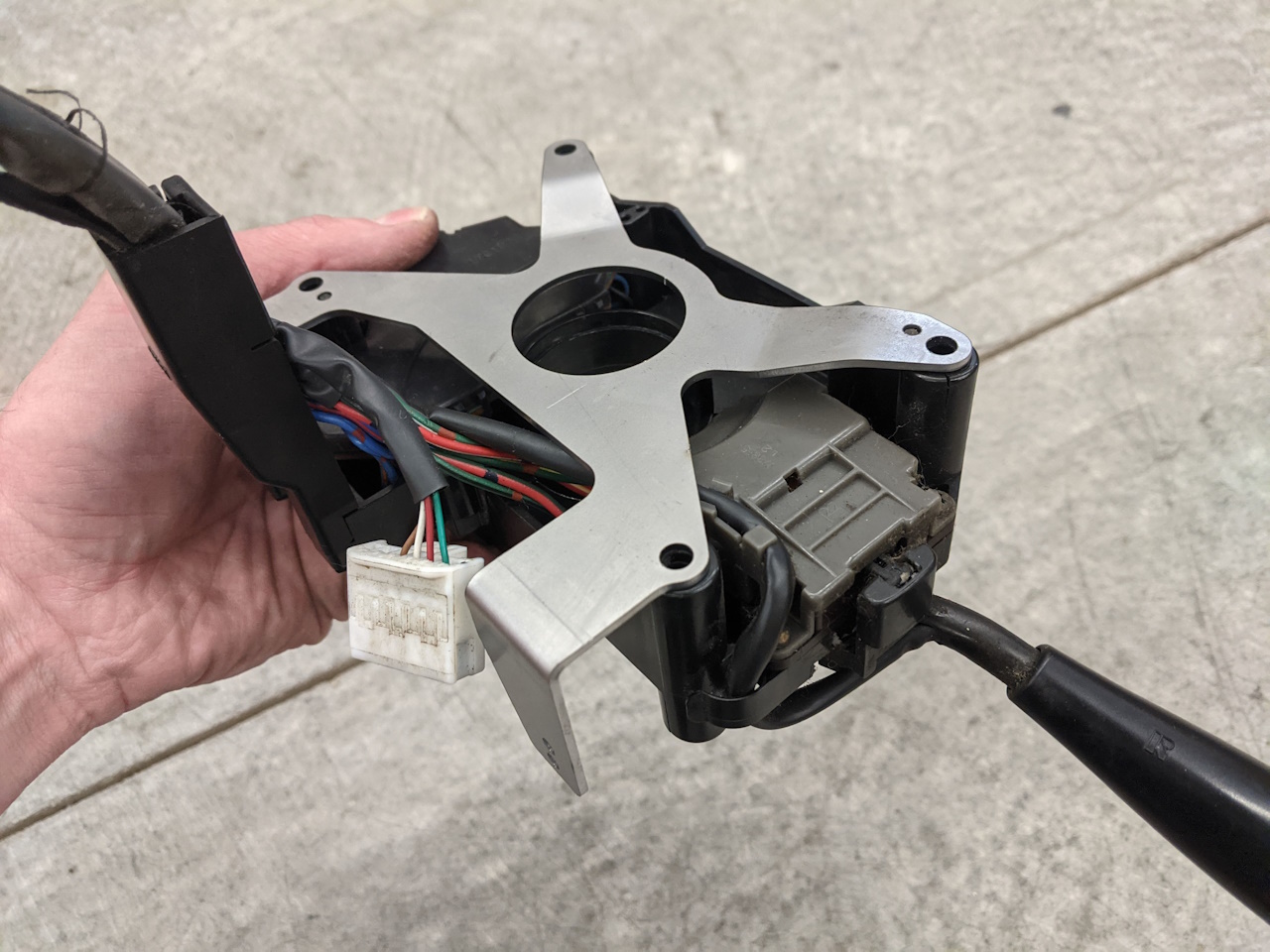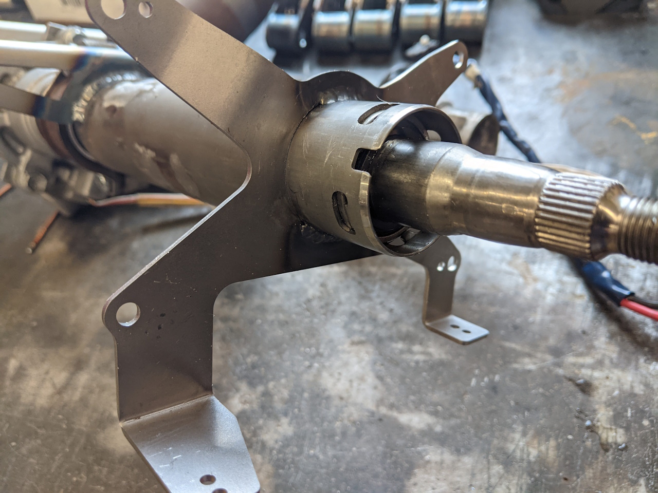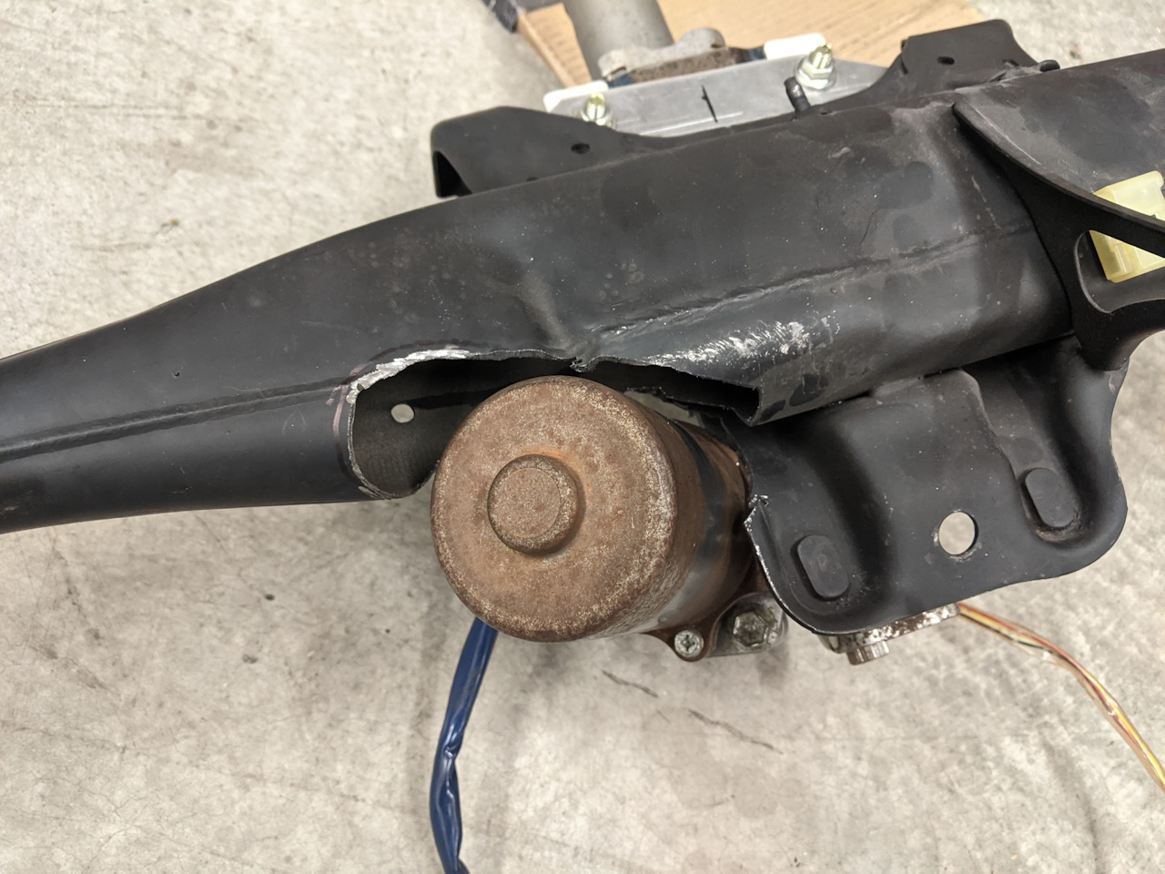 Here are the two brackets welded to the Yaris column. The Yaris column is two pieces and the motor can be clocked relative to the upper part. But both of the welded brackets are on the upper part, so care must be taken to align them before welding, or the combination switch will end up crooked. Unfortunately it turns out that mounting the stock column shroud on only 2 out of 3 mounting points allows it to move too much, eventually breaking the 30+ year old plastic around the mounts. It was probably starting to fail anyway. For now I'm just running without the shroud. The smooth Yaris column, once painted black, is so much cleaner looking that the bulky MR2 tilt mechanism that the lack of the shroud doesn't look too bad. At some point I may add another bracket to the column for the third mounting point.