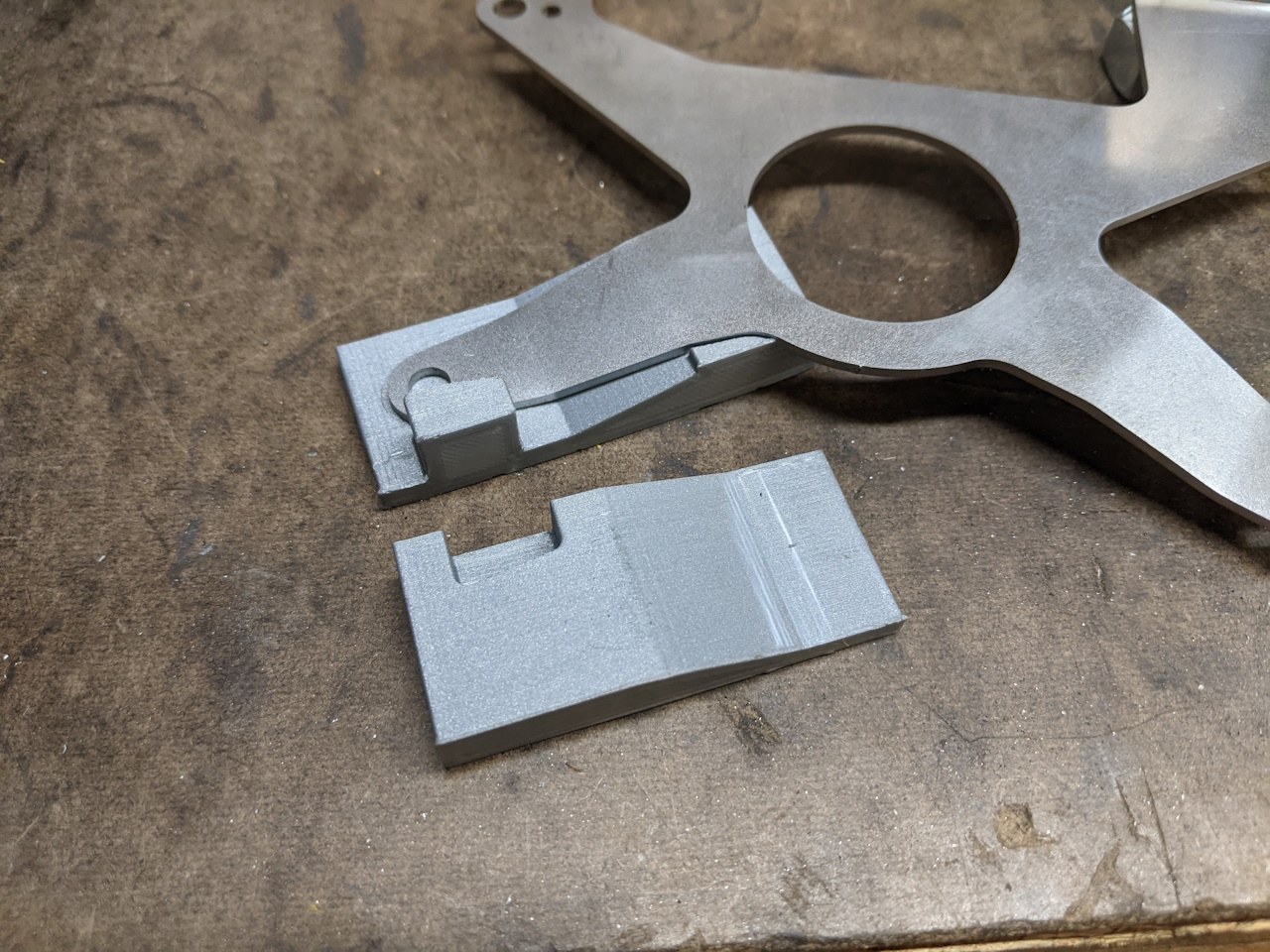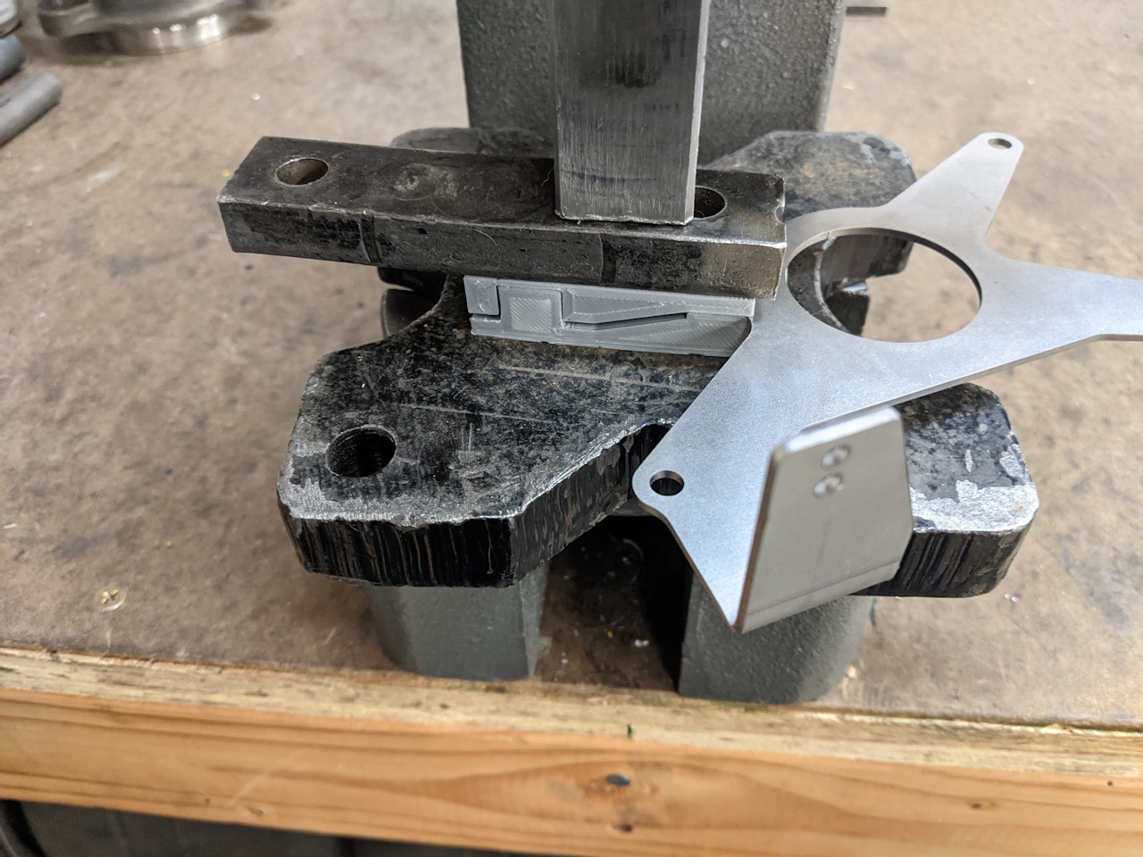 To mount the stock combination switch and steering column shroud to the Yaris column I drew up a bracket and had it laser cut and bent. To match the stock shape, I 3D printed a joggle die to use with my arbor press. It worked extremely well and created a pair of bends that would have been difficult to bend otherwise due to lack of a good reference on the part.
