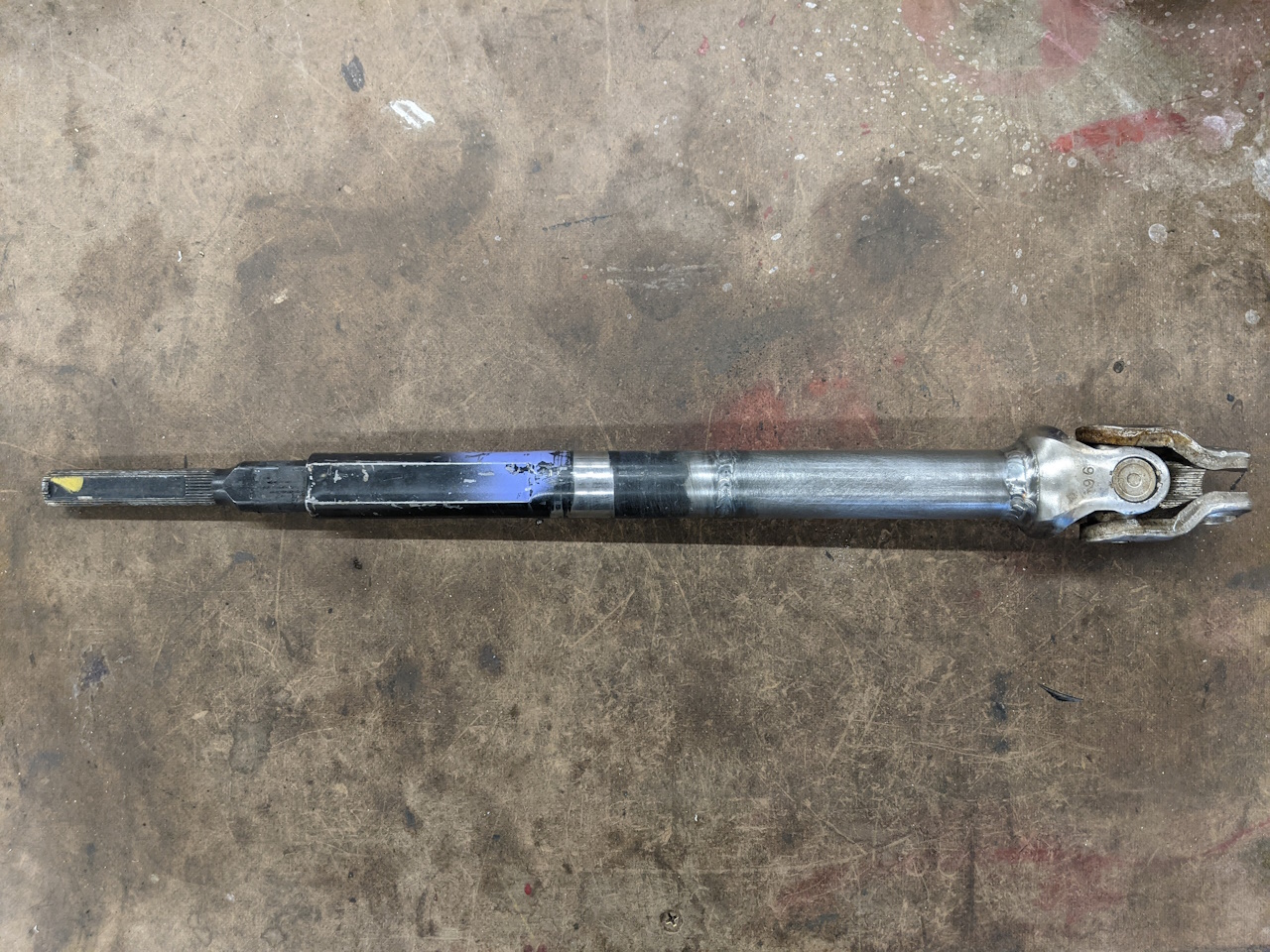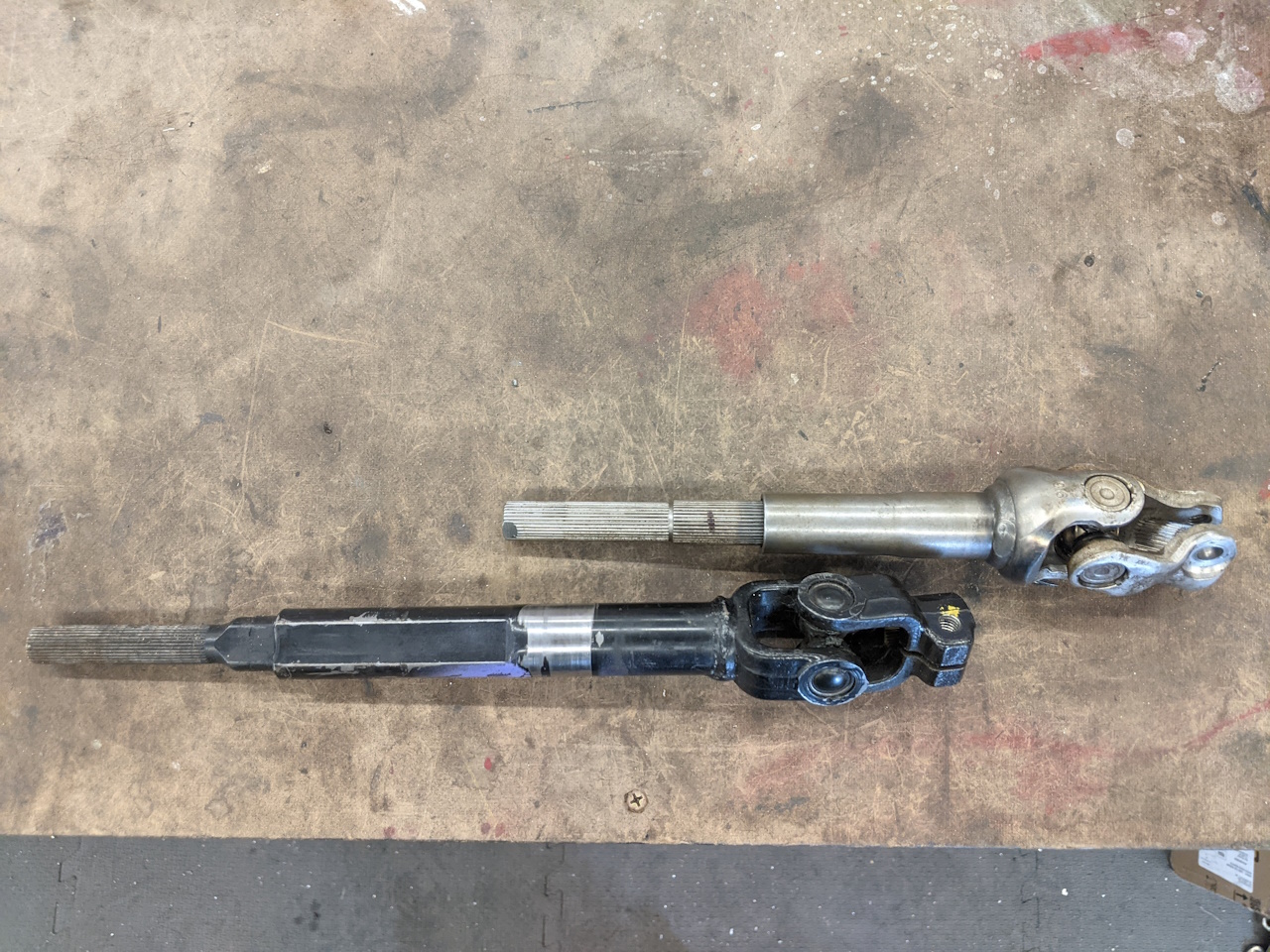 The Yaris steering column has a larger spline on it than the MR2 column, and is shorter. So a custom longer steering shaft is required. I purchased a Yaris steering shaft shown here next to the original MR2 shaft. I cut both, and welded in a section of 1" DOM steel tube. The collapsible lower portion of the MR2 column is retained this way.