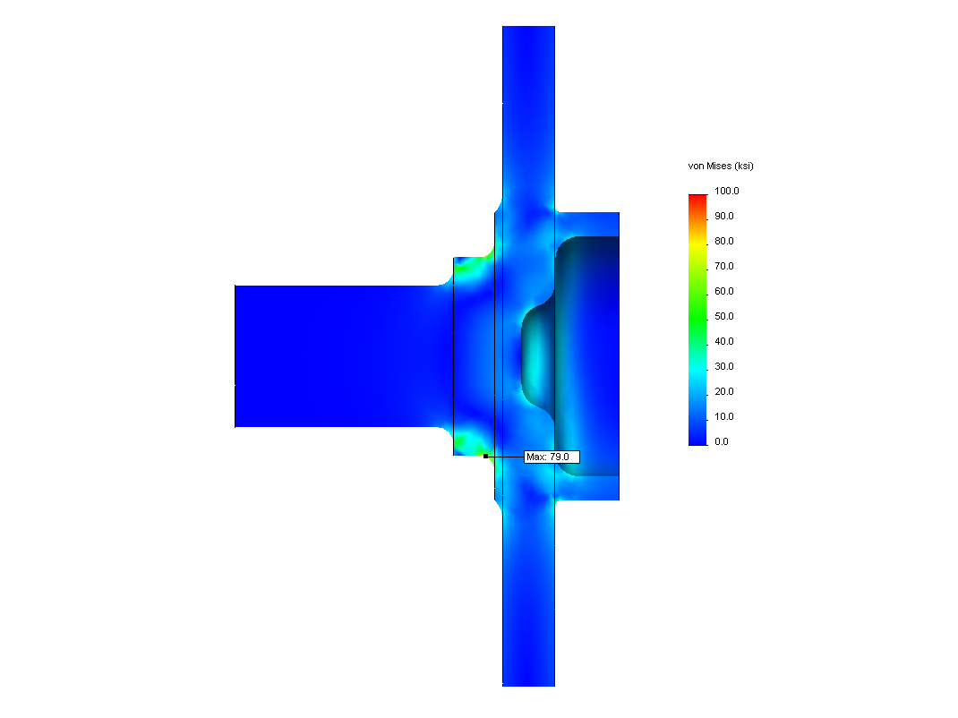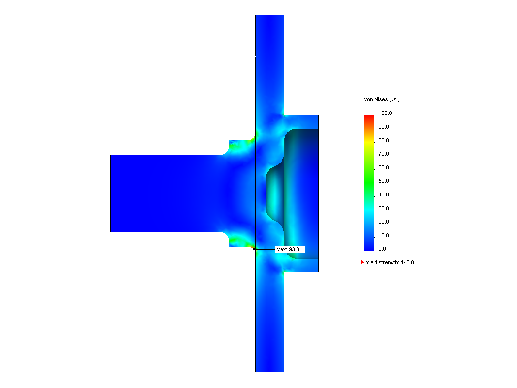 With these loads applied, the stock 91/92 MR2 hub shows a peak stress of just over 93ksi (1ksi = 1000psi). As you might expect, the peak stress is right at the point where they fail. This is where the crack starts, and over time grows until the flange separates from the spindle.
