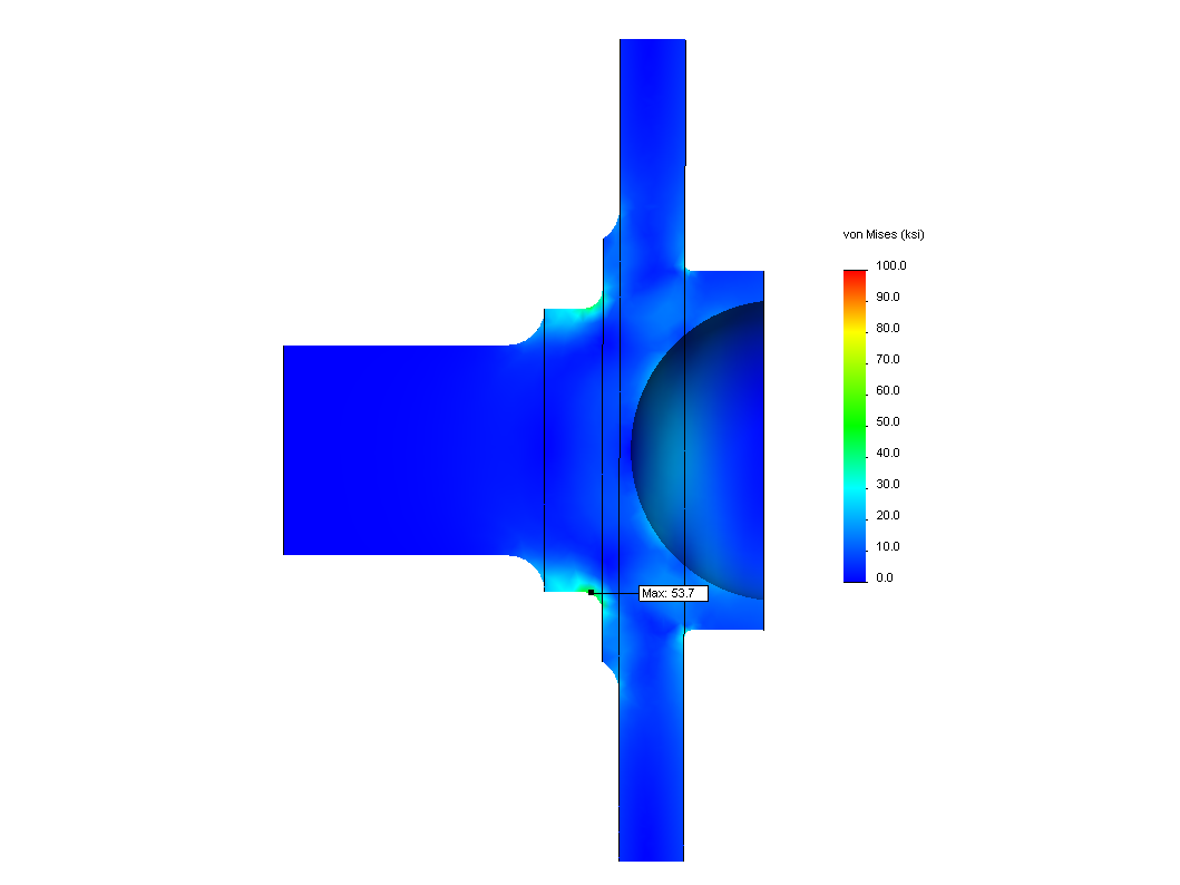Now, keep in mind that the loading used here is for a significant cornering load. Driving in a straight line where the only significant load is the vertical one drops the peak stress to only 2.2ksi! And the level of cornering load seen on a street car is MUCH less than that seen on the track. This is why the stock hubs will last pretty much forever on a daily driver, but tend to fail on track cars (endurance racing cars in particular). Also keep in mind that 1.2g is a cornering load that can easily be reached with modern street tires without aero. If you are running r-compound tires and or aero on your track car, loads will be much higher!