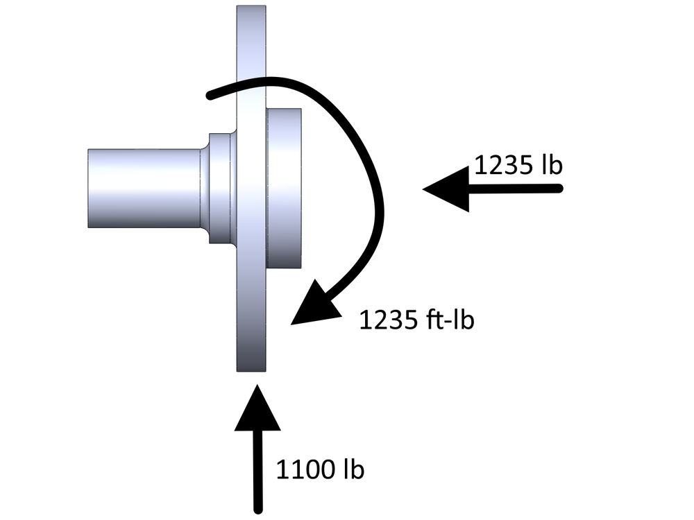 Load for this analysis is applied in three ways, all based on the cornering force generated by 1.2g cornering in a 2800lb MR2. The largest source of load on a hub like this is due to the cornering force generated at the contact patch attempting to fold the wheel / tire / hub under the car. This is applied to the hub as a torque about a line running front to rear, perpendicular to the axis of the hub. The torque is calculated using the cornering load with the radius of the tire as the moment arm (1235lb x 12in = 1235ft-lb). The cornering load is also applied as an axial force pushing on the hub (1235lb). In addition to that, an 1100lb vertical load is applied. This is greater than the static front corner weight as at 1.2 lateral g most of the weight has been transferred to the outside wheel. An MR2 will often lift the inside front wheel completely off the ground when cornering hard.