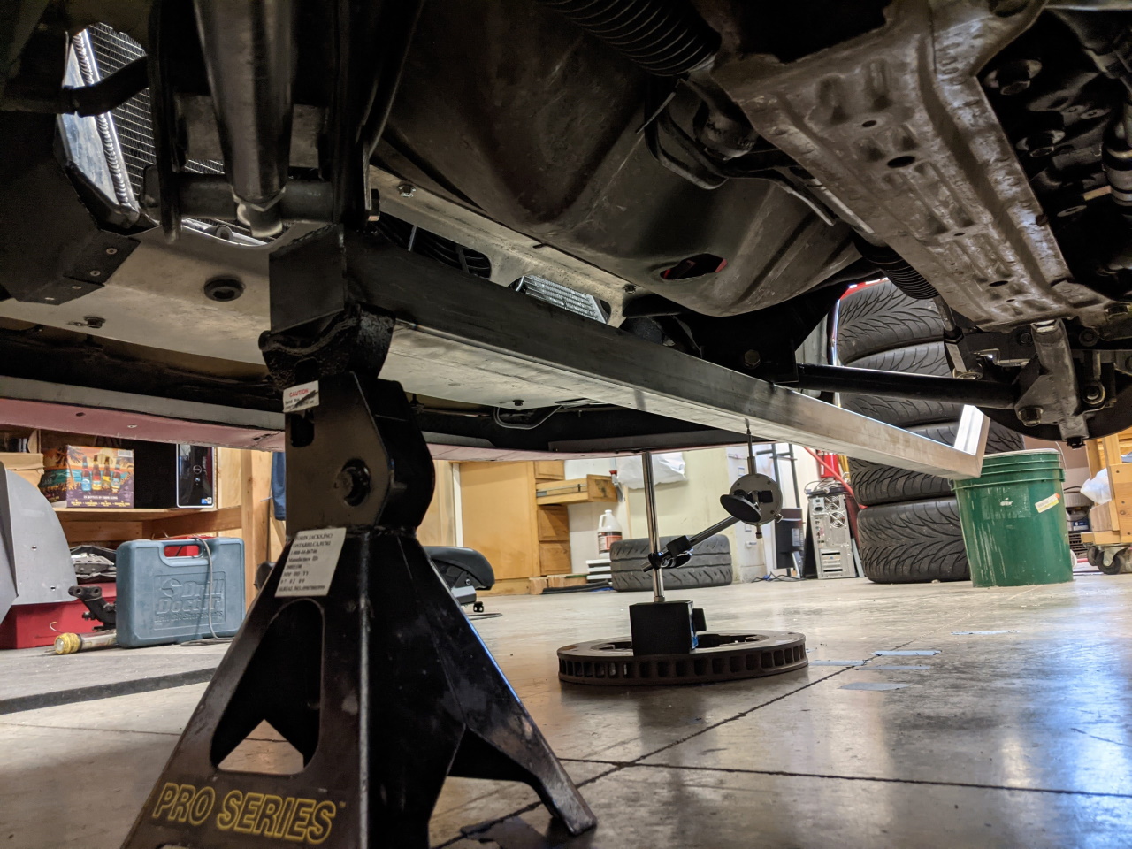Measuring torsional chassis stiffness is actually easier than one might think. Support the chassis on 3 points, apply a torque to the end with the single support, and measure the deflection. I will admit, I copied the basic method from a YouTube video. I supported the rear of the car with two jack stands under the rear mounting bolts of the rear cross member.