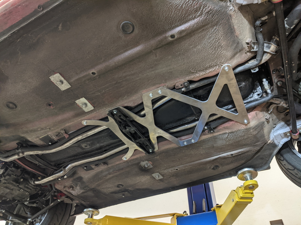 I tested the removal of the parking brake bracket for a couple of reasons. One, I had removed it along with the parking brake system earlier this year for weight reduction reasons. Two, the center tunnel of the car is where a lot of the cars strength comes from, and tying the bottom of the tunnel together can have a significant effect (a square tube being much stronger than a C section). In this case it didn't seem to change much, but I'm not ruling out a brace there as an area for future improvement.