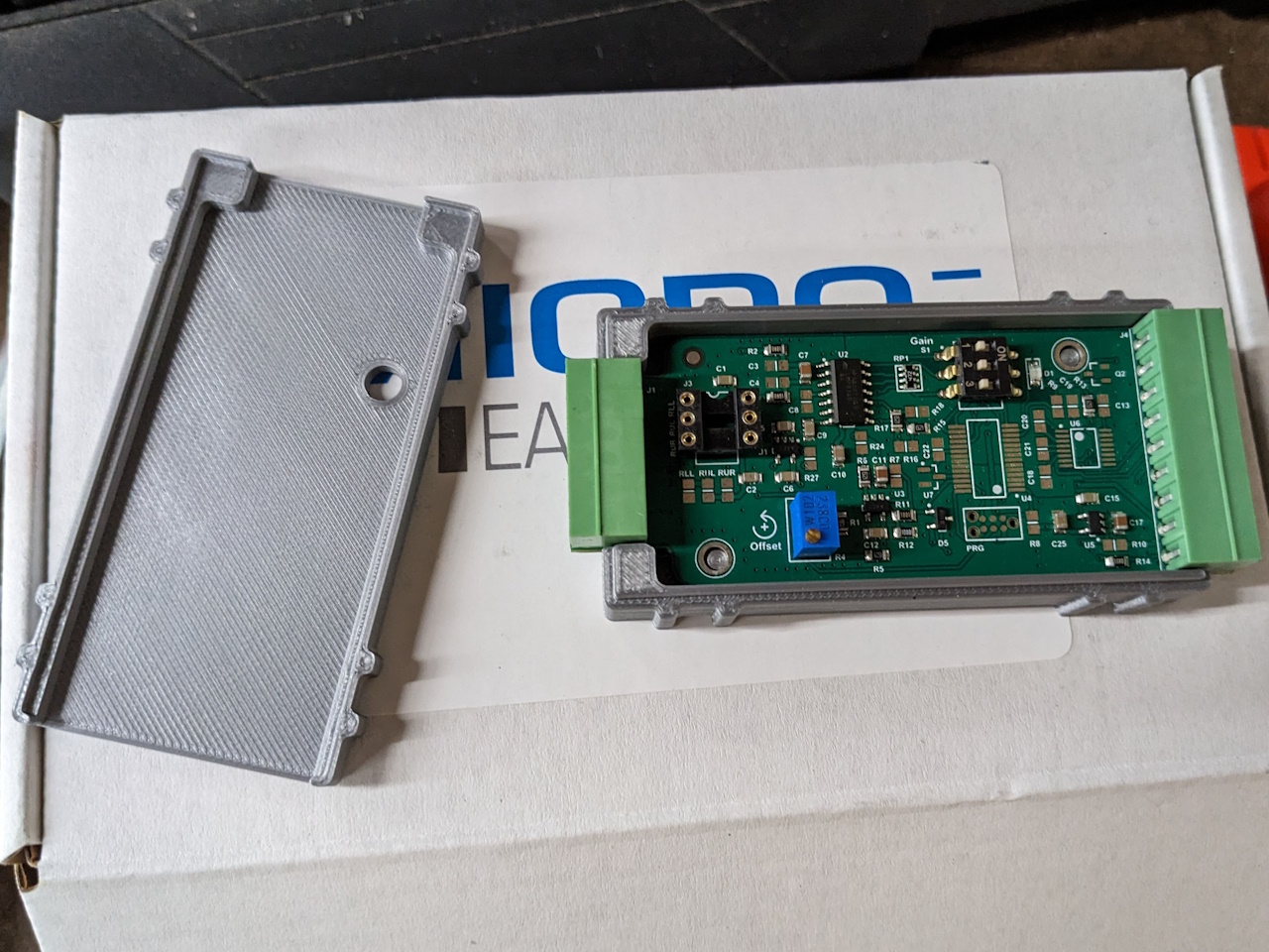 I designed and 3D printed my own enclosure for the amp. Two halves that nest together and close with zip ties with a hole to access the manual zero point adjustment screw.