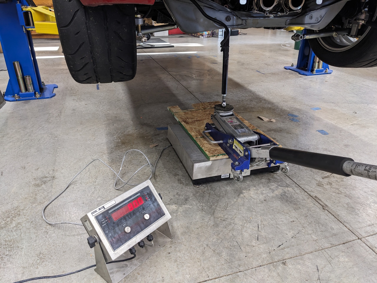 After initial verification with a multi meter and raw voltage readings I hooked the output of the amplifier up to my Race Capture Pro data logger and configured it with an equation to convert the voltage value to a force value before logging. The level of sensitivity of this setup is pretty amazing. I can grab the wheel with my hands and push / pull on it and see the force values in the tie rod change, down to a few pounds of force. Much later I rechecked the calibration to further verify the data I had gathered in testing. The verification was done with a heavy duty scale and a jack, as shown below. Strain gauge readings matched the scale within about 1% up to 400lb, which is plenty of accuracy for my purposes.
