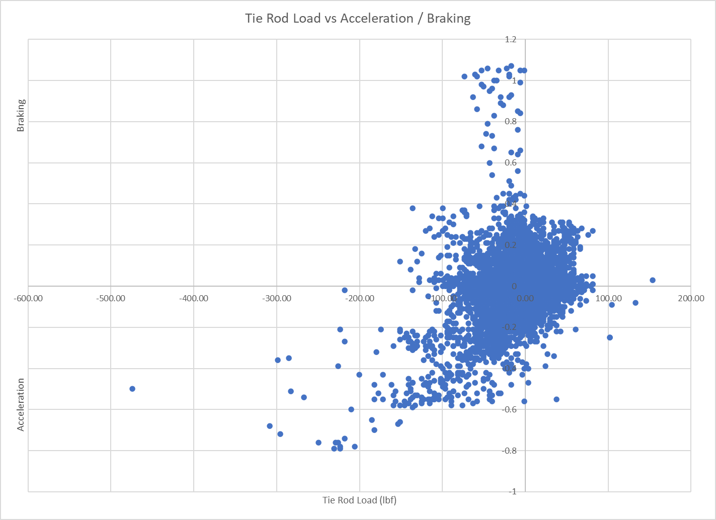 I also collected data at an autocross event. Below is all of the tie rod load data from 10 autocross runs, plotted against lateral g. Interestingly, despite seeing lateral acceleration in the 1.2+g range, peak tie rod load barely exceeded 330lb, less than my previous street testing predicted. I can think of a couple possible reasons for this, one being that you are almost never just turning or just accelerating in autocross, you are almost always doing both at the same time. It is possible that the combined loading actually cancels out some of the load on the tie rod. It is also possible that as lateral load increases the tire deforms enough to significantly change the scrub radius, reducing the rate at which tie rod load increases relative to lateral load.