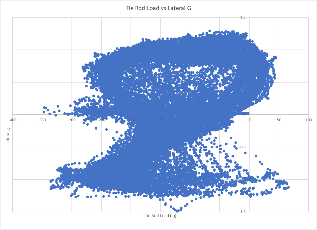 Lateral acceleration around a long cloverleaf on ramp produced a nice concise correlation between lateral g and tie rod load, which extrapolates out to about 350lb/g.