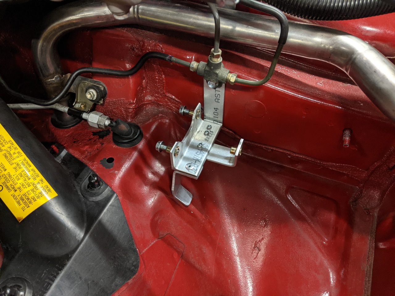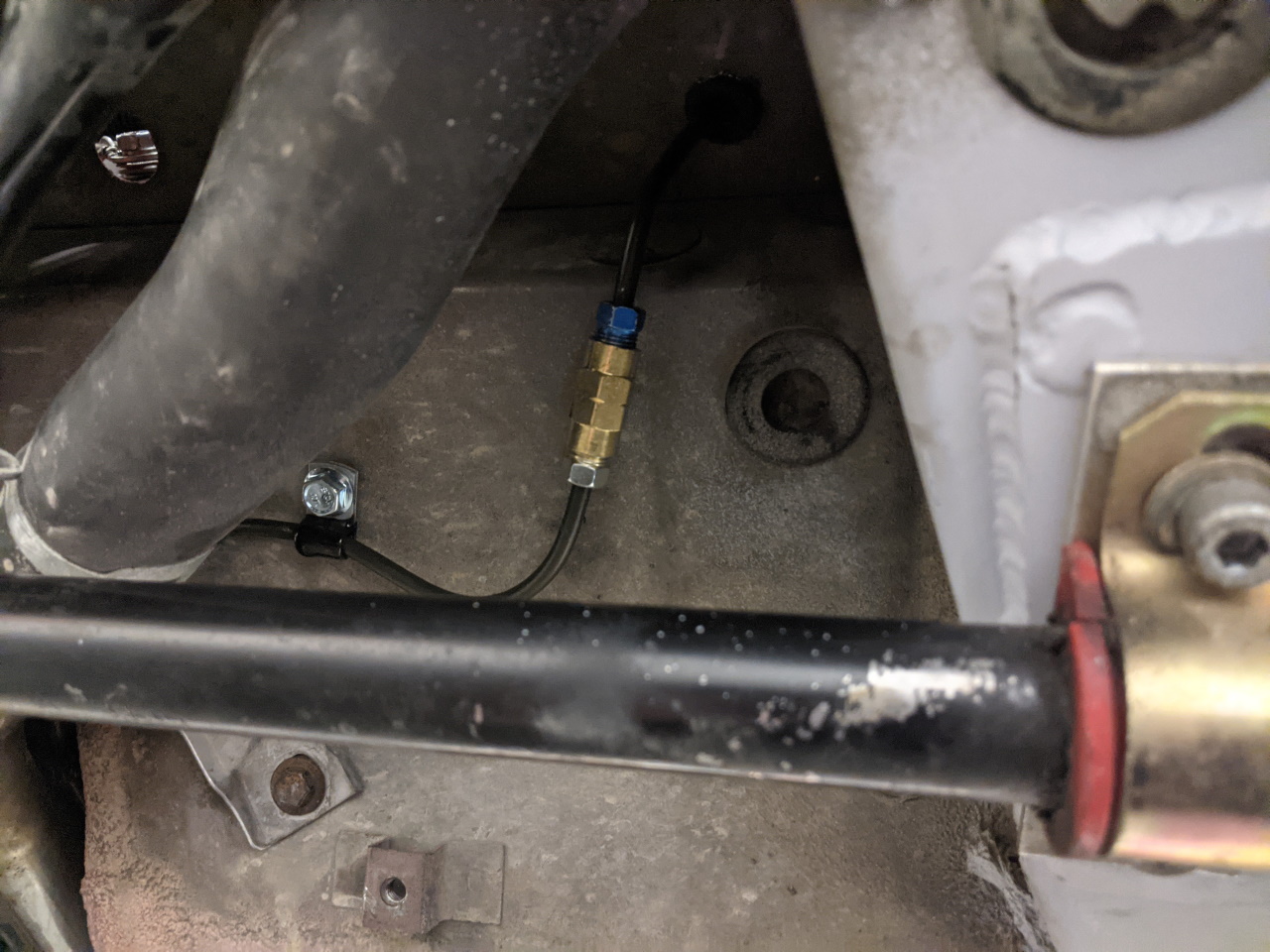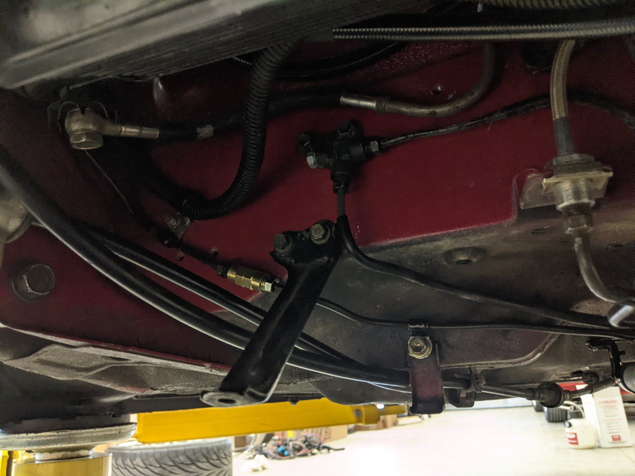 At the back of the car, the left rear brake line was bent down and p-clamped to an existing stud in the firewall. The new brake line attaches with a p-clamp and an aluminum space to an existing thread for one of the under cover brackets, and the two are connected with a union. The right rear lines passes through the stock T, with the left outlet plugged. If you wanted to hunt it down, the 96+ MKII with ABS has special union here with two elbows mounted on a bracket that would probably work well. But finding one might be tricky.