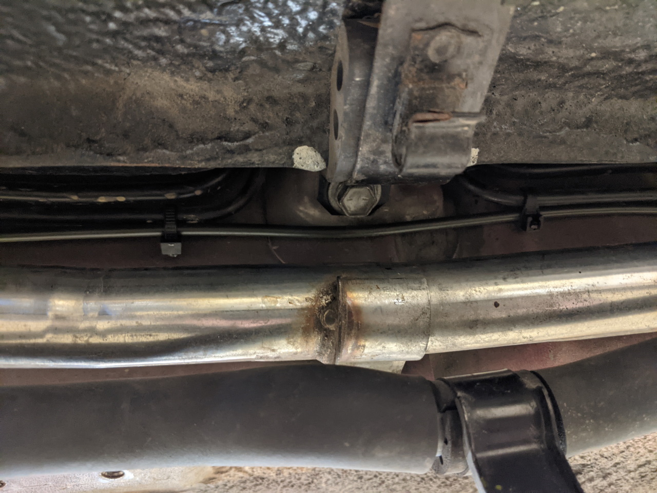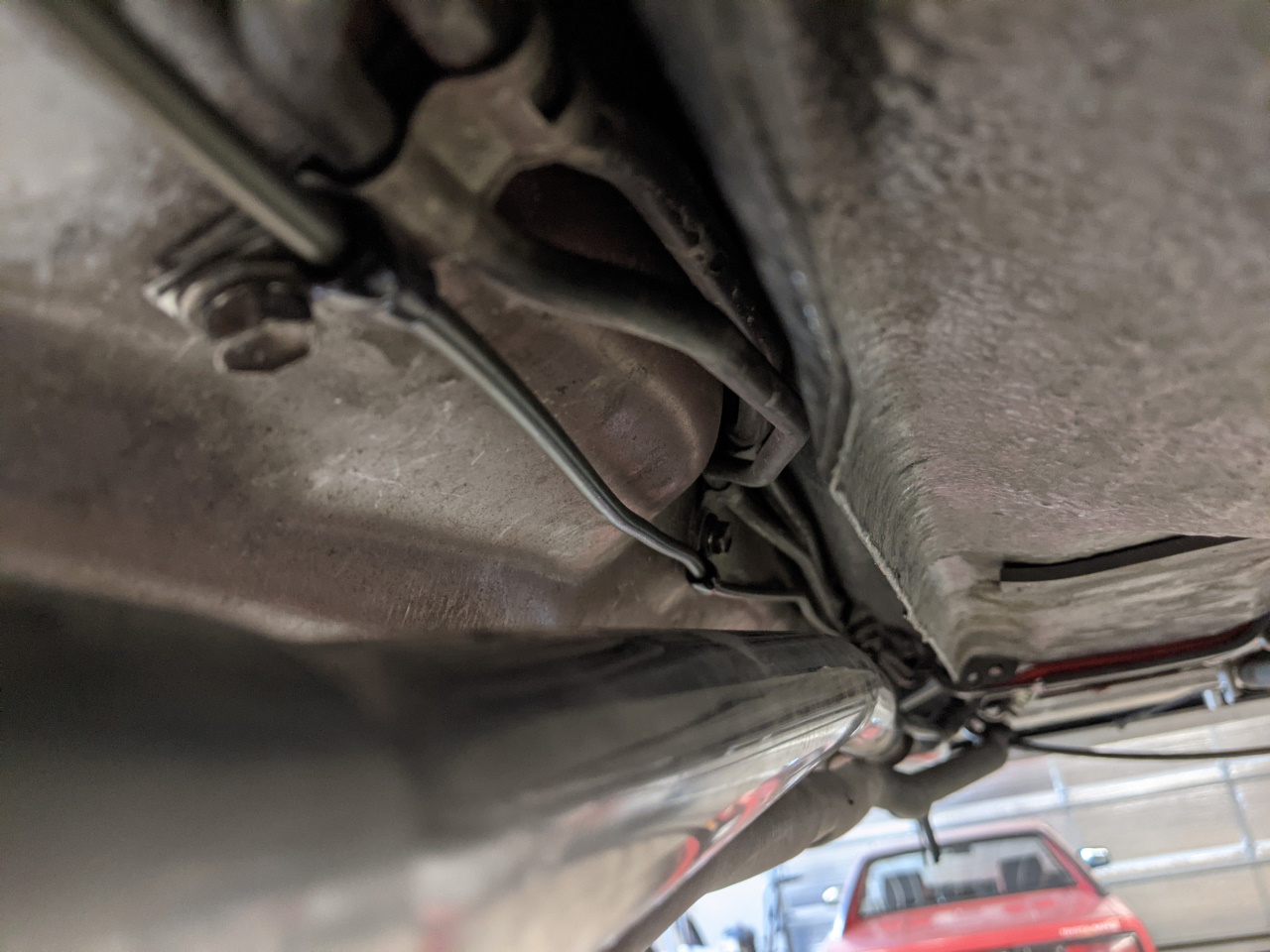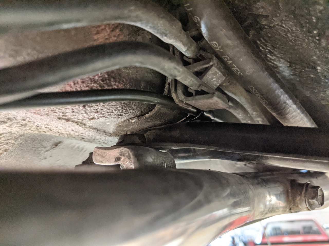 At the back of the car, the left rear brake line was bent down and p-clamped to an existing stud in the firewall. The new brake line attaches with a p-clamp and an aluminum space to an existing thread for one of the under cover brackets, and the two are connected with a union. The right rear lines passes through the stock T, with the left outlet plugged. If you wanted to hunt it down, the 96+ MKII with ABS has special union here with two elbows mounted on a bracket that would probably work well. But finding one might be tricky.