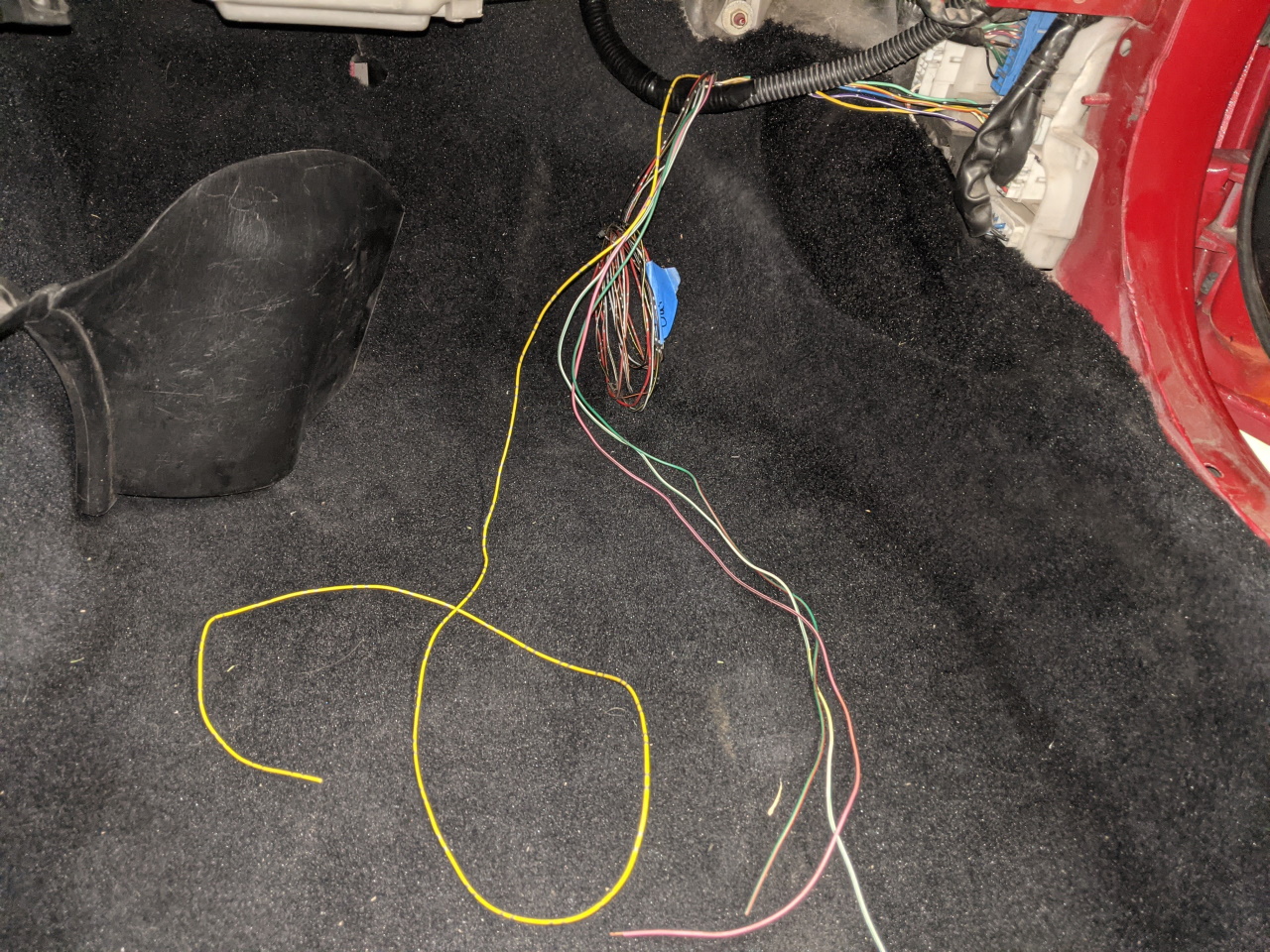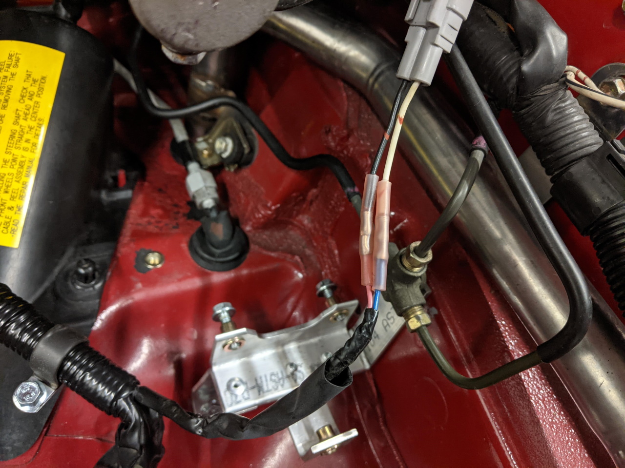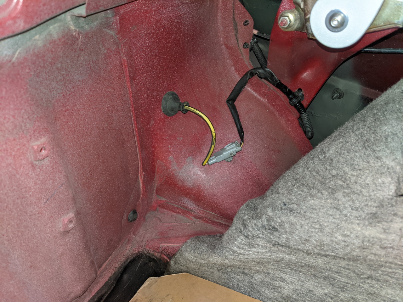 This car didn't come with ABS, although some of the wiring was already in place (for various reasons). For example, the dash harness has all of the ABS wiring and the connector for the ABS ECU. The body harness was actually the Turbo body harness from my first MR2, which I had swapped in when I installed the 3SGTE in this car, and then modified when I swapped to the 2GR. So a connector for the ABS sensor was present for the left rear, but it's in the trunk due to my routing of the harness through the fender instead of the engine bay. I'm not sure if this chassis ever had a connector for the right rear, but it didn't at this point. However I did still have the old cruise control harness (probably from my green car), which also includes the wire for that sensor.