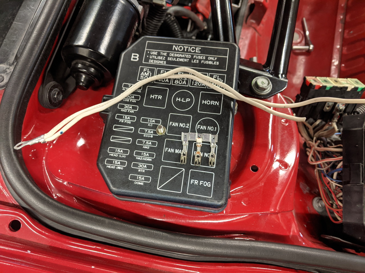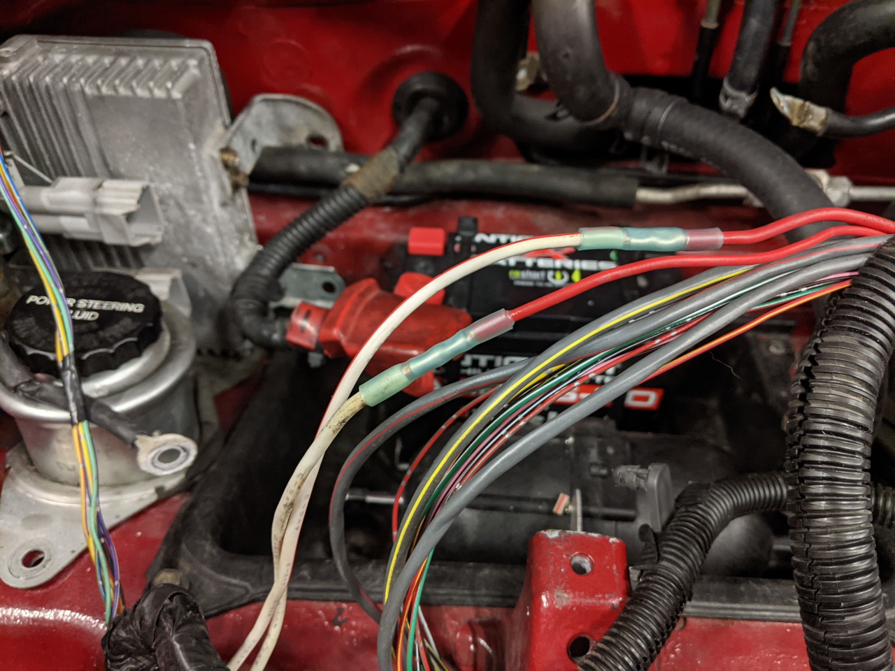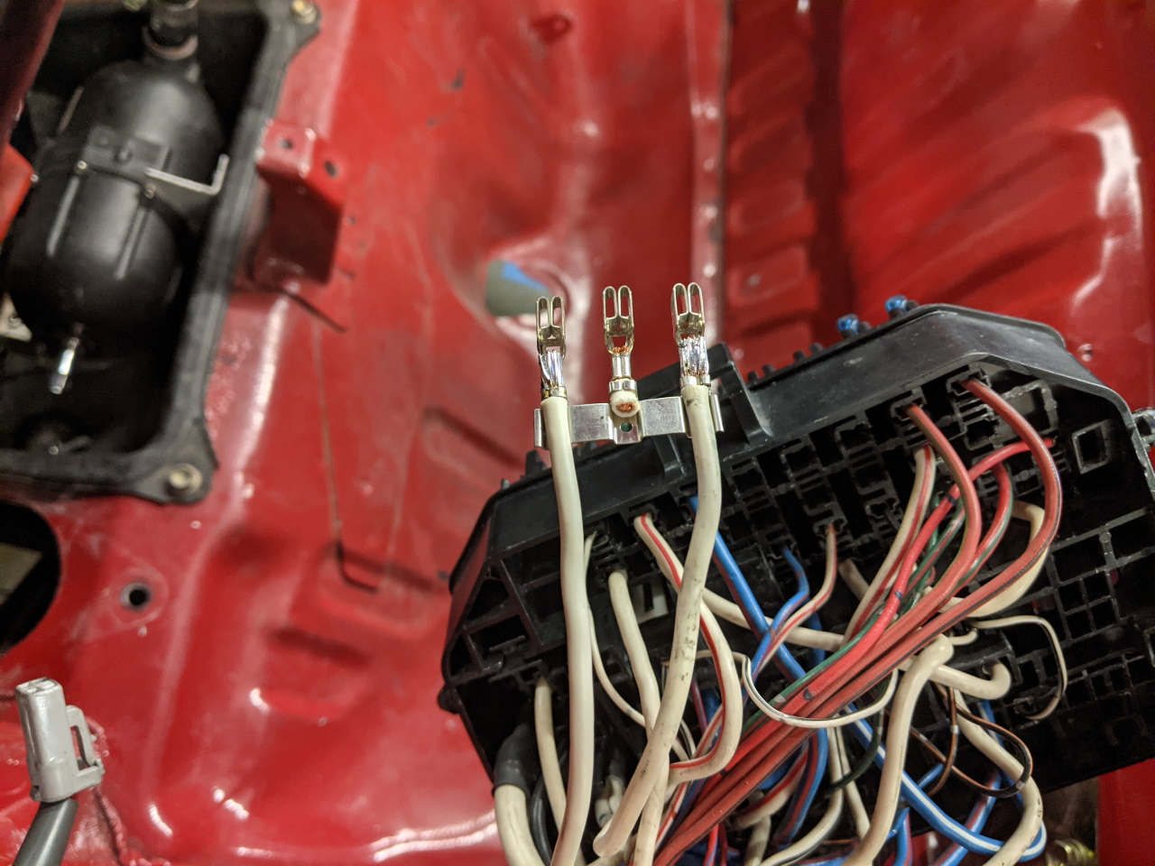As mentioned previously the the power wires needed to be extended, and the left front sensor needed a different connector spliced on. Crimp connectors with integrated heat shrink are my preferred way to accomplish this sort of thing. The power wires were also salvaged from my spare MKII harness. They already have terminals on the other end compatible with the fuse box, so they just snapped into place. But if I hadn't had those I would have just put a ring terminal on them and attached it to the 80 amp ABS fuse just like the stock MKII wiring.