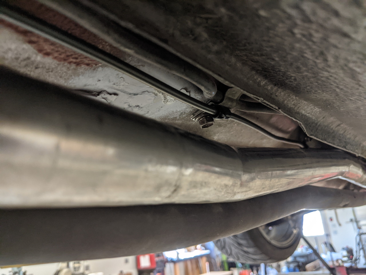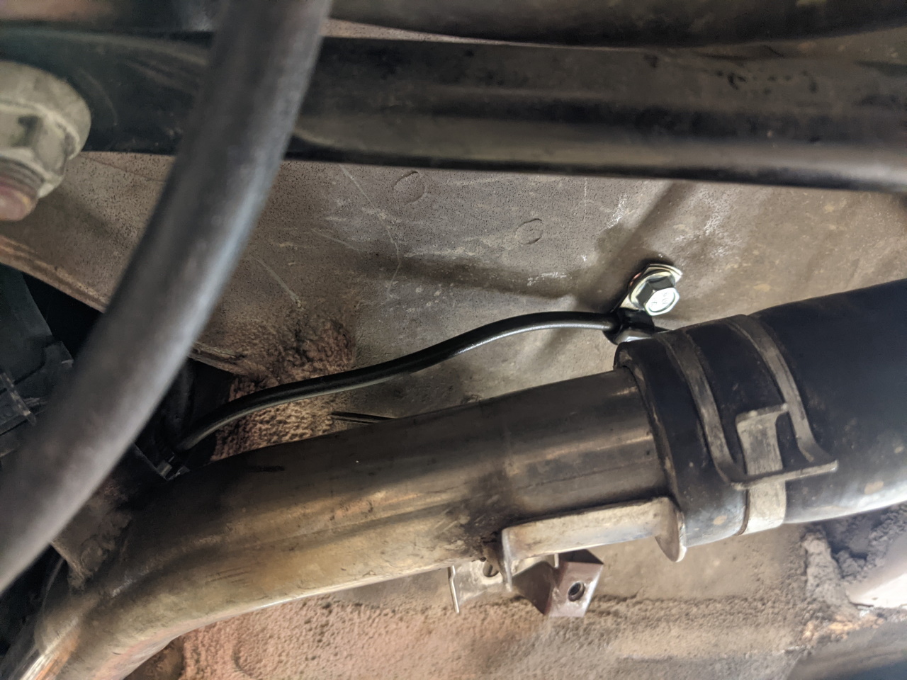 At the front, rather than following the stock line up past the front of the tank I turned left and followed the coolant pipe. I added a rivnut here for a p-clamp, and will drill a hole to pass the line up into the frunk near the coolant pipes pass through.