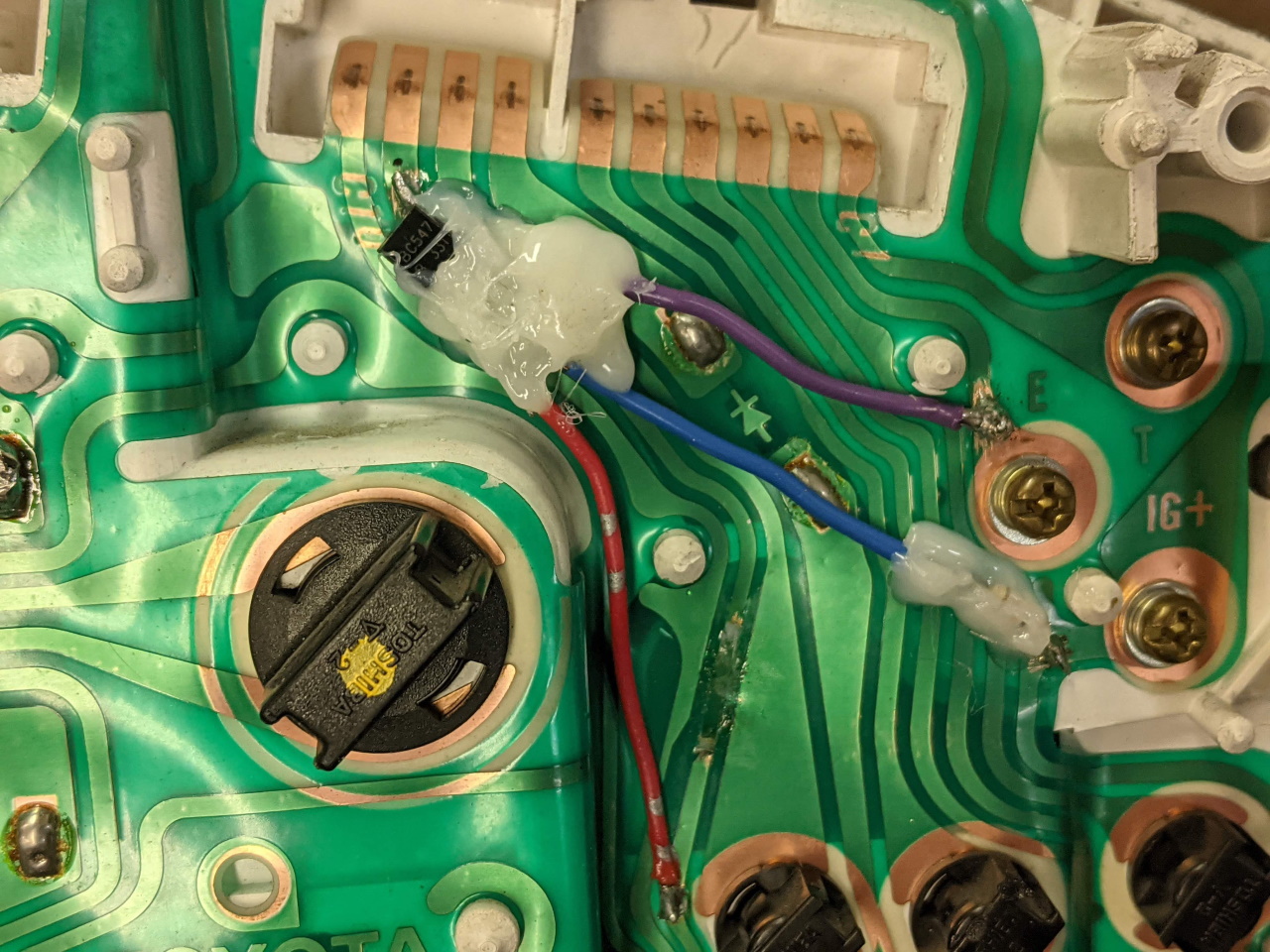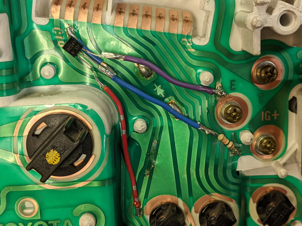 Thanks to Jim King on the MR2OC forum for providing the solution to this. An NPN transistor (BC547 is the part number I bought), a 10k ohm resistor, and some soldering skills are required. I installed it on the back of the gauge cluster as shown below, but it could also be built into the wiring harness somewhere.